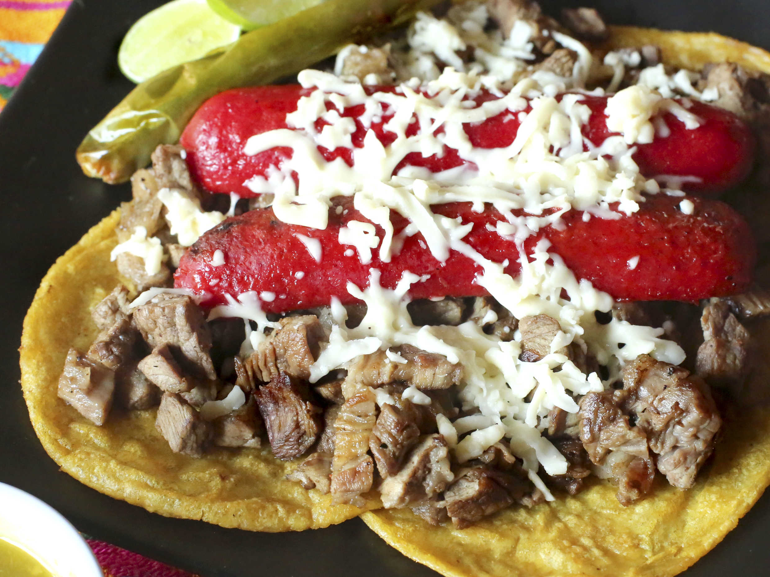 Combinación de carne asada y salchicha, gratinada con queso, acompañados de cilantro y cebolla.