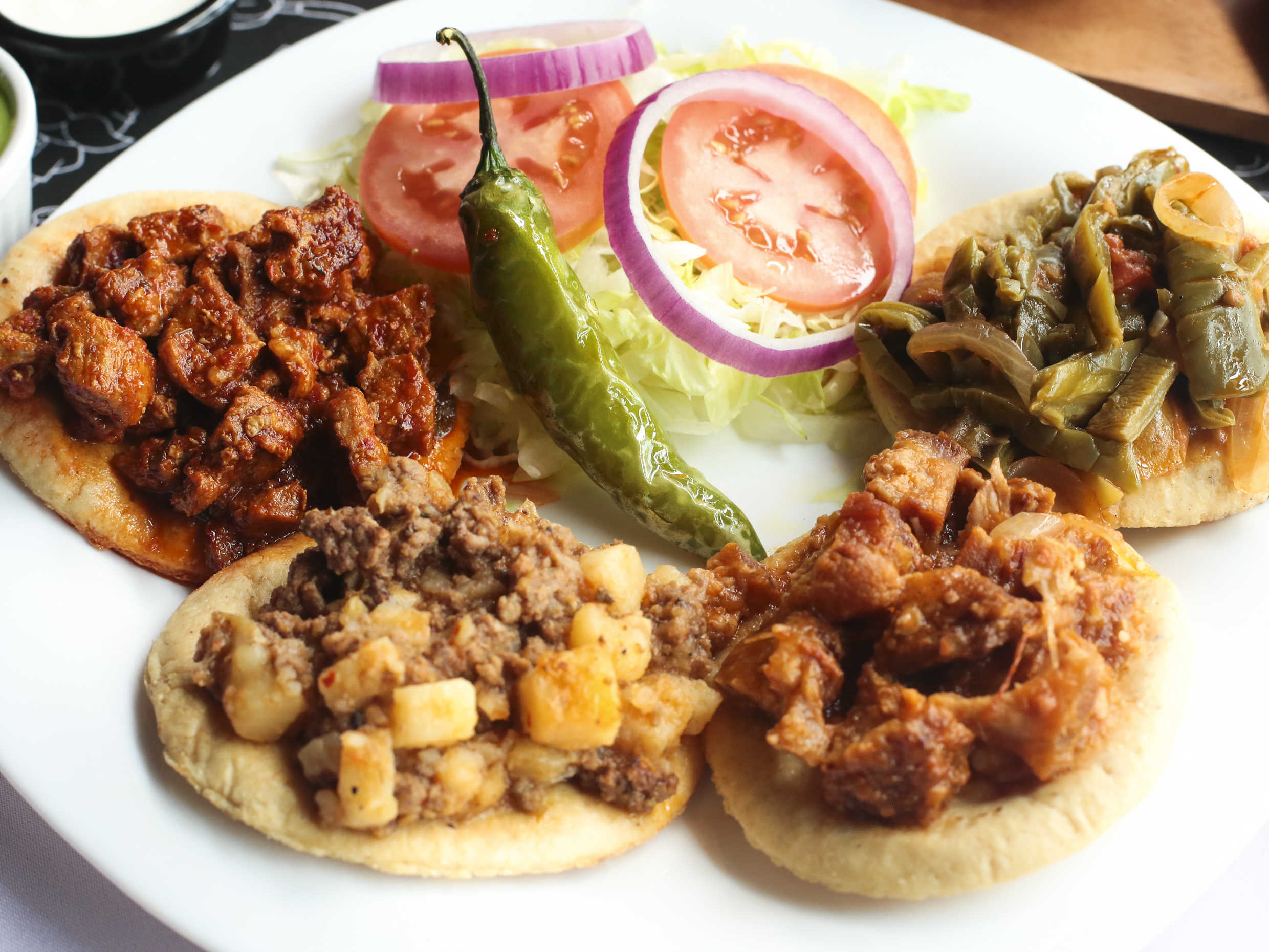 Exquisito sope con base de frijolitos y el guiso que elijas acompañado de verdura y salsa.