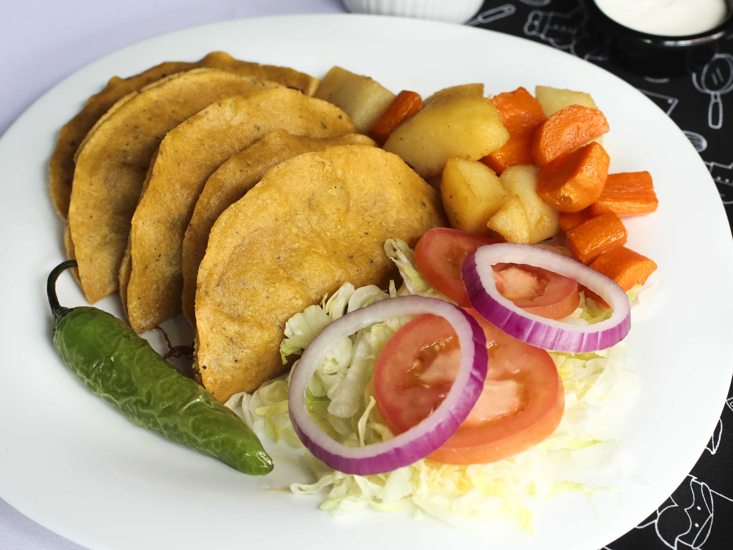 Tacos dorados rellenos de carne deshebrada, acompañados de verdura, salsa de aguacate, crema y papas, 5 piezas.