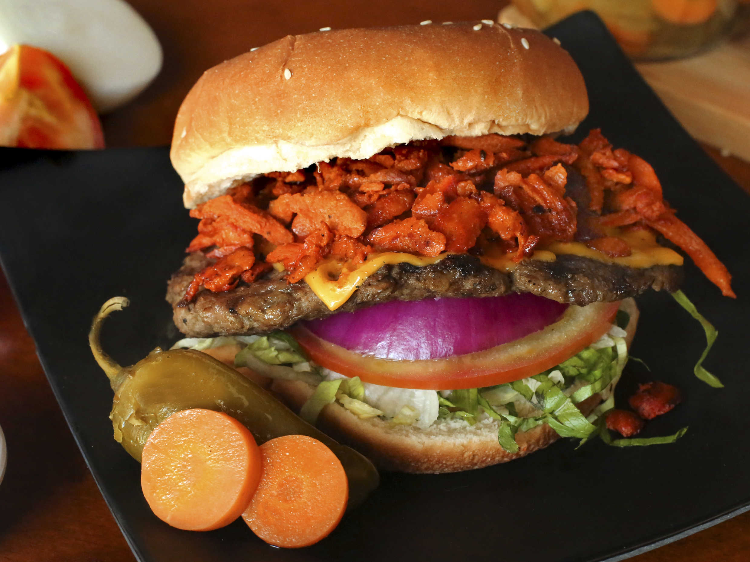 Hamburguesa de res con nuestra receta especial ,la delicia del trompo , queso , jamón ,aguacate , lechuga , tomate , cebolla y pepinillos.