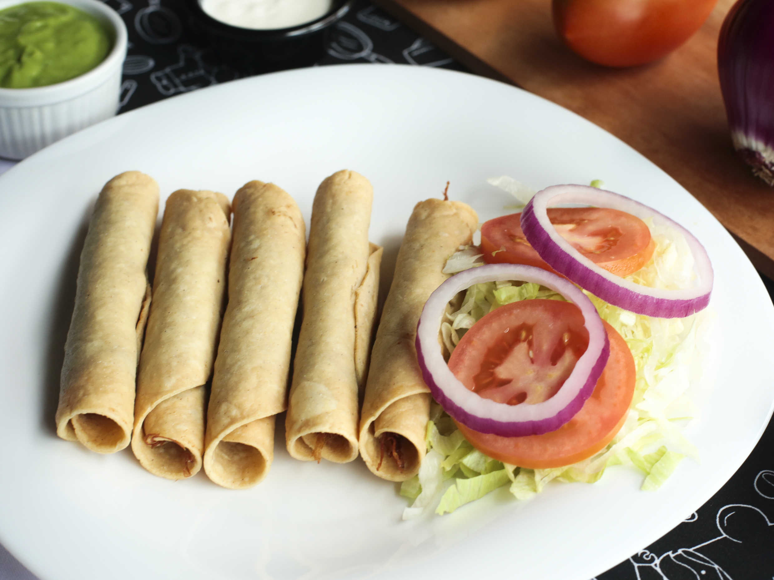Flautas rellenas de carne deshebrada, acompañadas de nuestra salsa casera de aguacate y crema, 5 piezas.