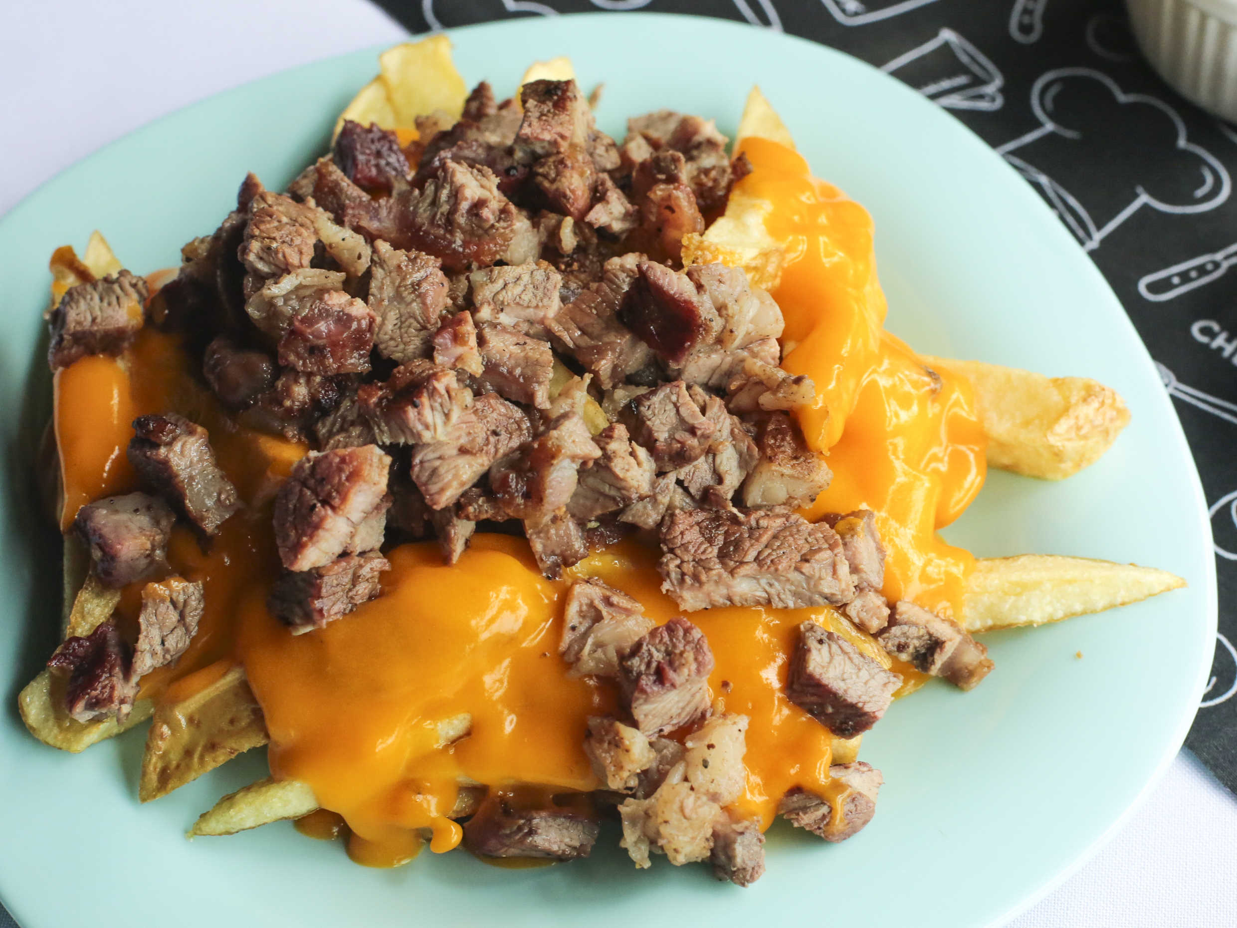 Papas fritas con carne asada y queso