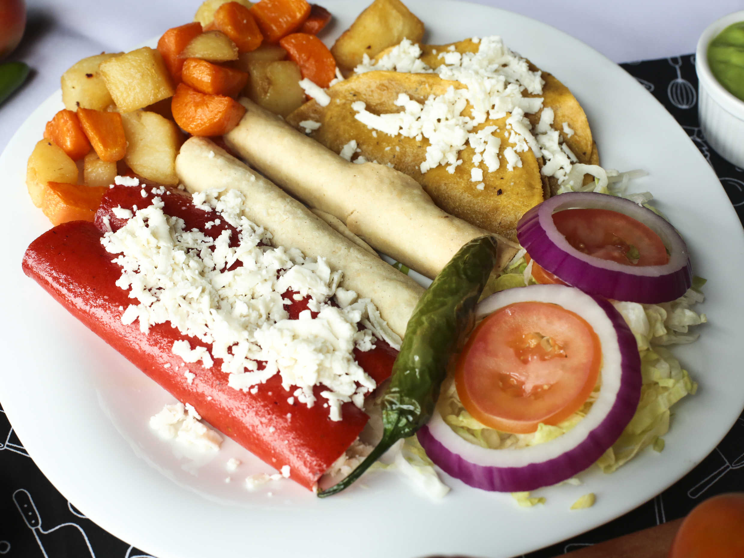 Rica combinación de 2 deliciosas enchiladas naturales , 2 Flautas y 2 Doraditos, acompañadas de verduras y papas. 6 piezas.