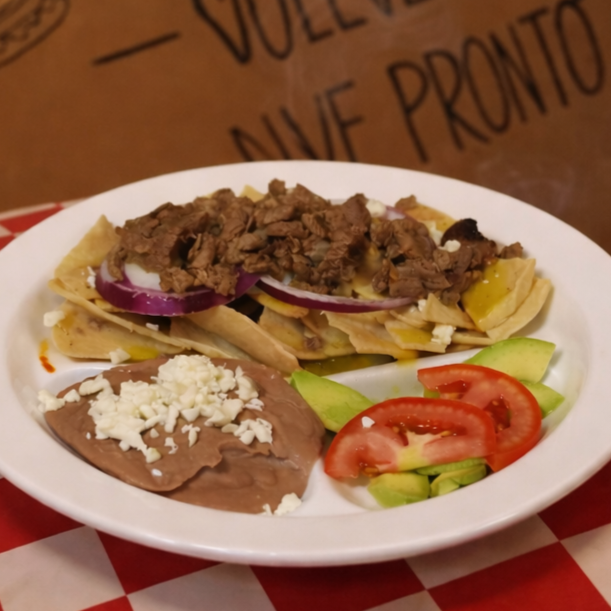 Deliciosos totopos tostaditos. Bañados en salsa roja o verde espolvoreados con queso panela, cebolla y un toque de cilantro y crema, acompañados de frijoles con queso y rebanadas de aguacate y tomate y carne asada