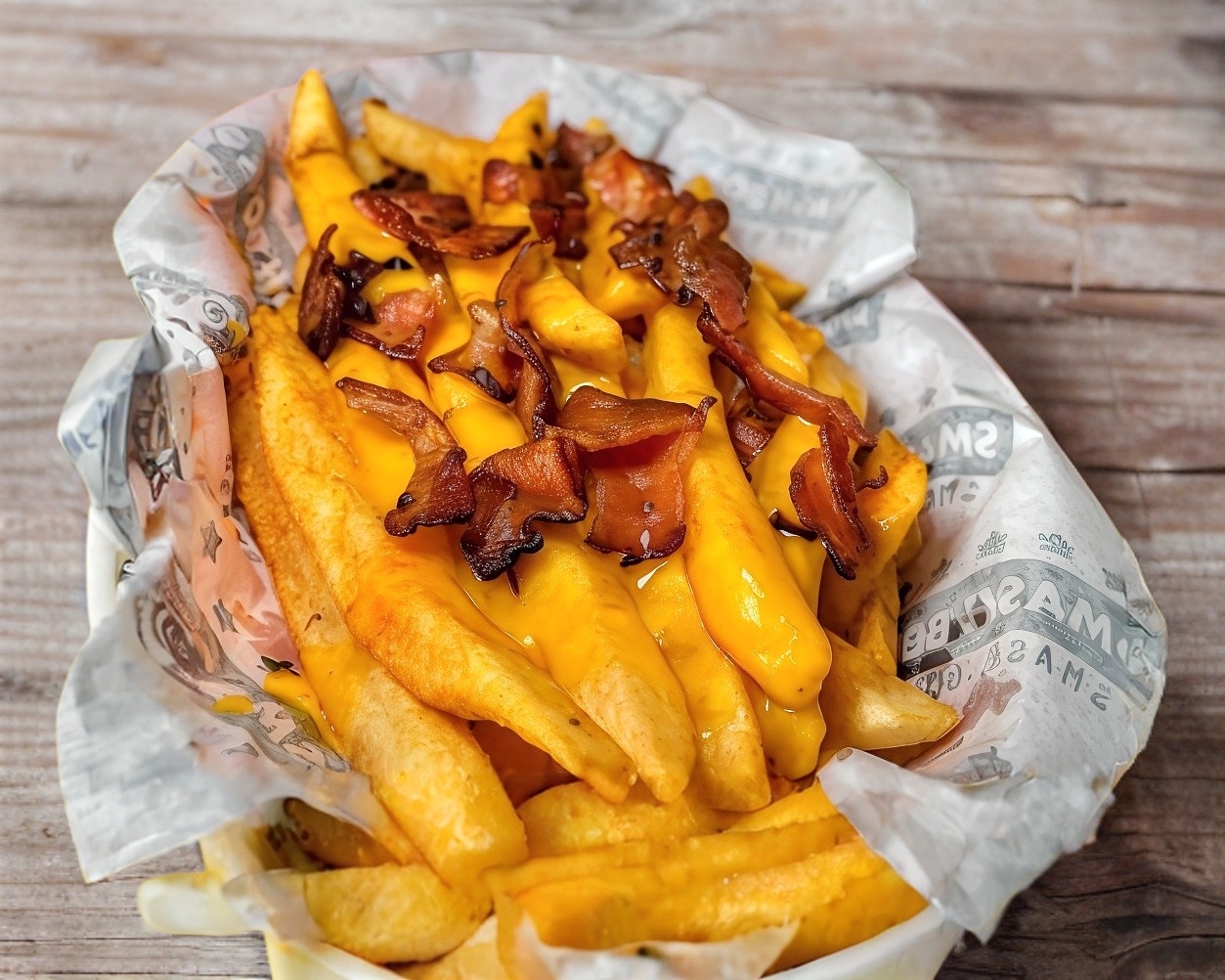 Orden de papas fritas bañadas en salsa de queso y tocino