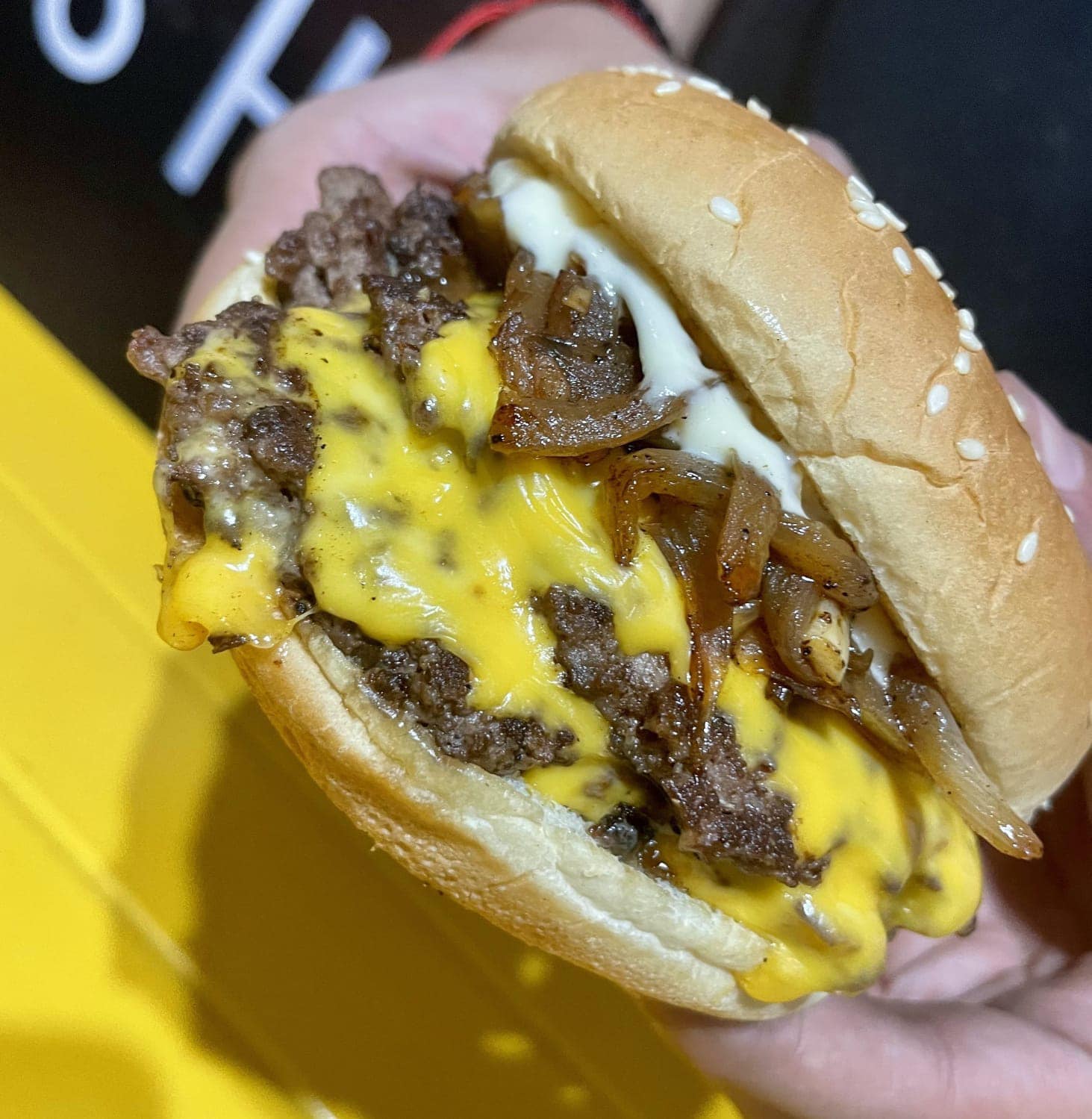 Doble carne gratinada en doble queso, con aderezo mayo ajo, cebolla y tocino caramelizada en cerveza, acompañada con papas