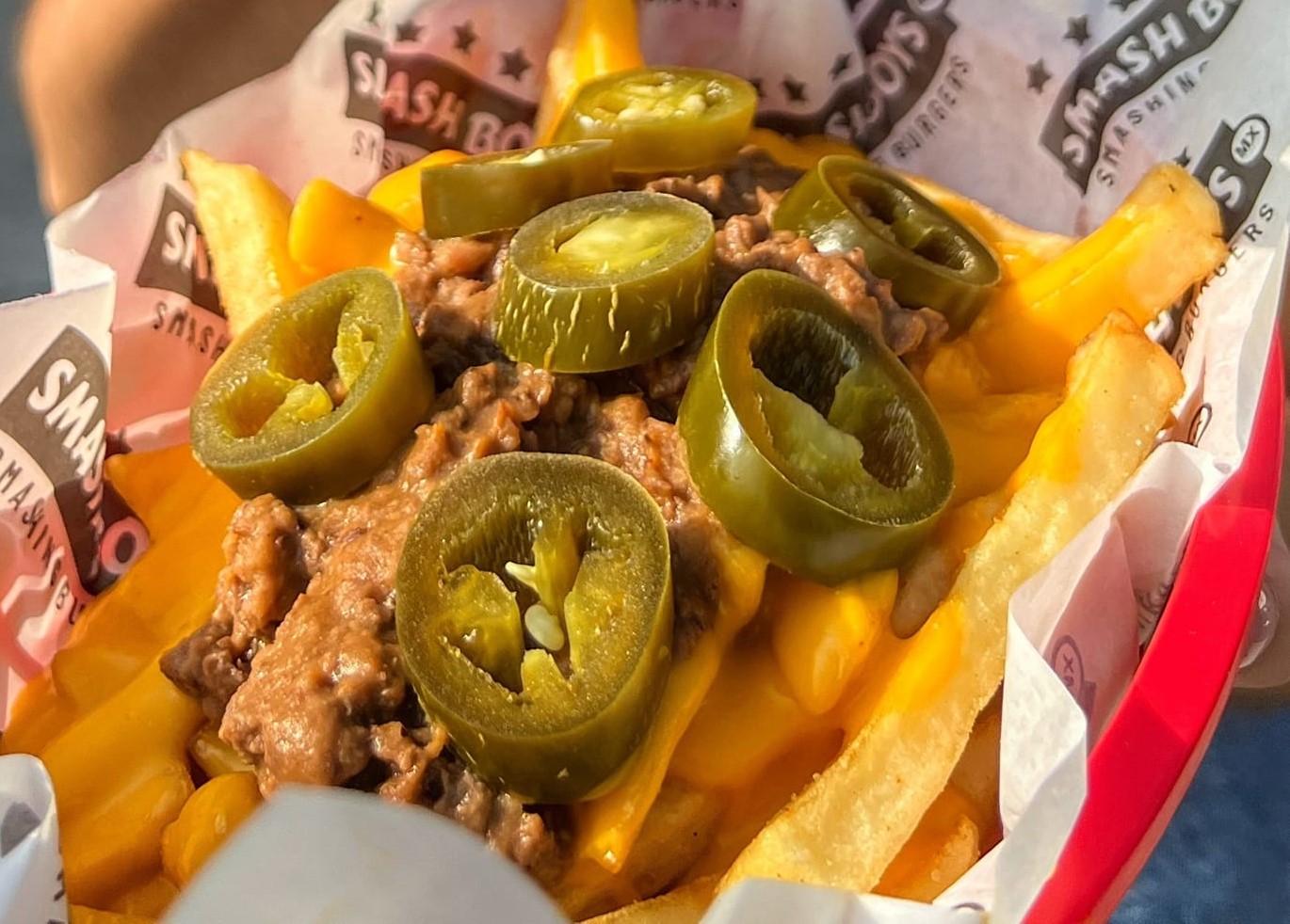 Orden de papas a la francesa bañadas de salsa de queso, chili y jalapeños
