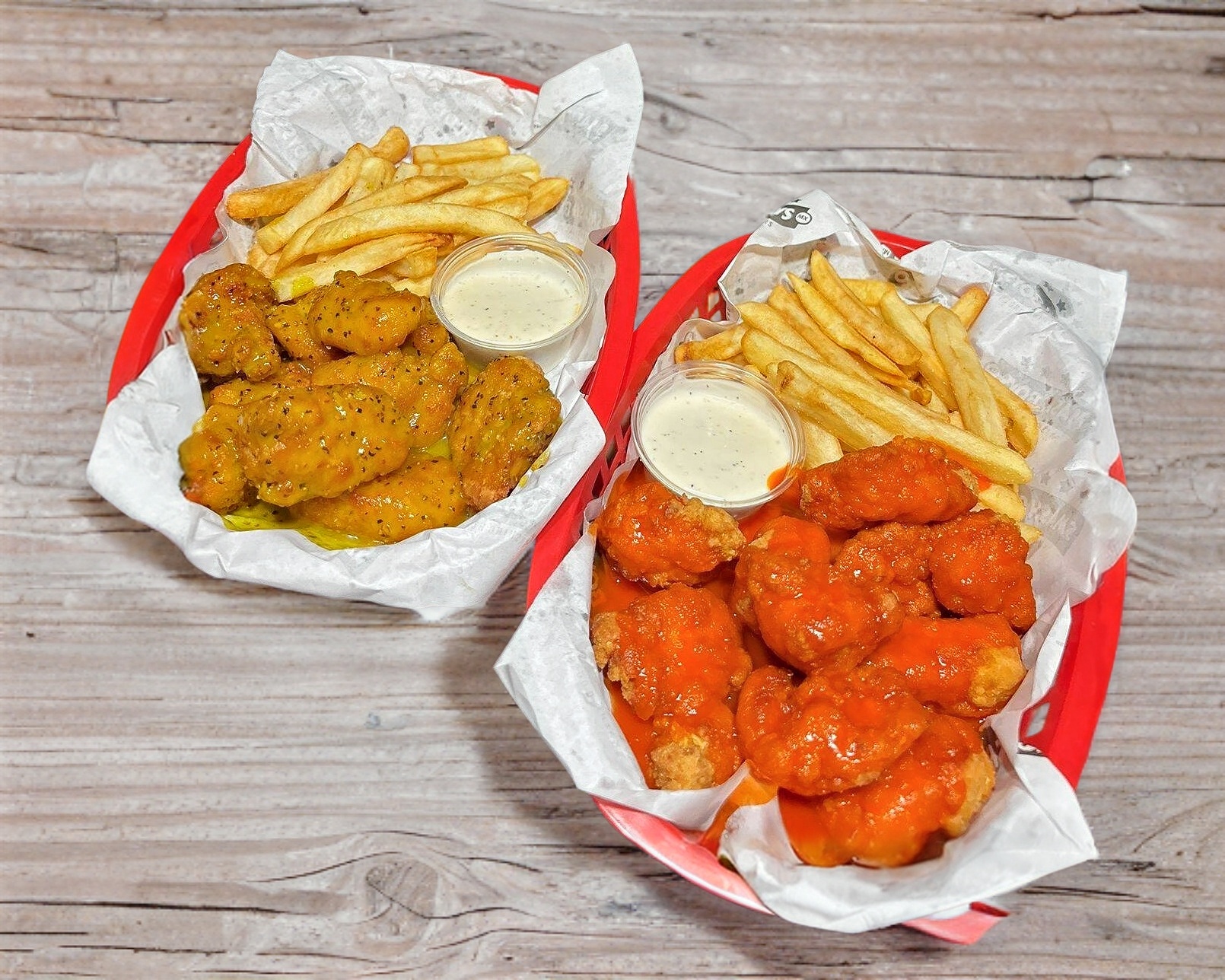 Platillo individual: pechuga de pollo empanizada bañada en salsa a elegir, acompañada de papas, catsup y ranch.
