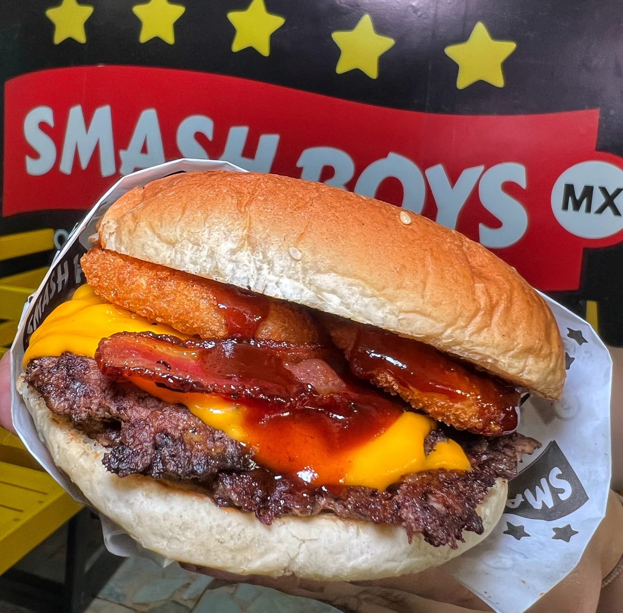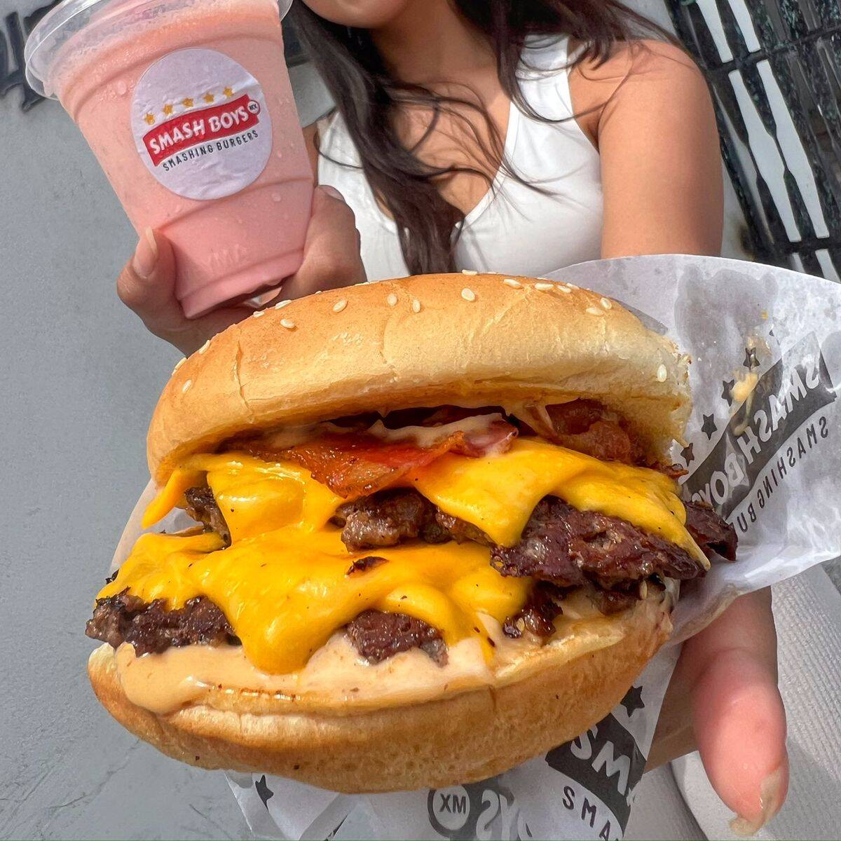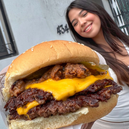 Cheese Burger individual: doble carne gratinada con 4 quesos, tocino y aderezo de chipotle, acompañada de papas.