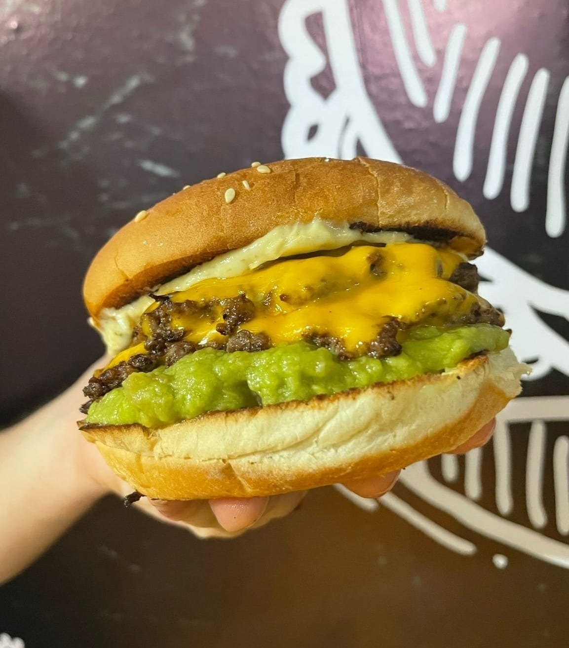 Doble carne gratinada en doble queso, guacamole con pico de gallo y con aderezo de mayo de serrano toreado, acompañado con papas
