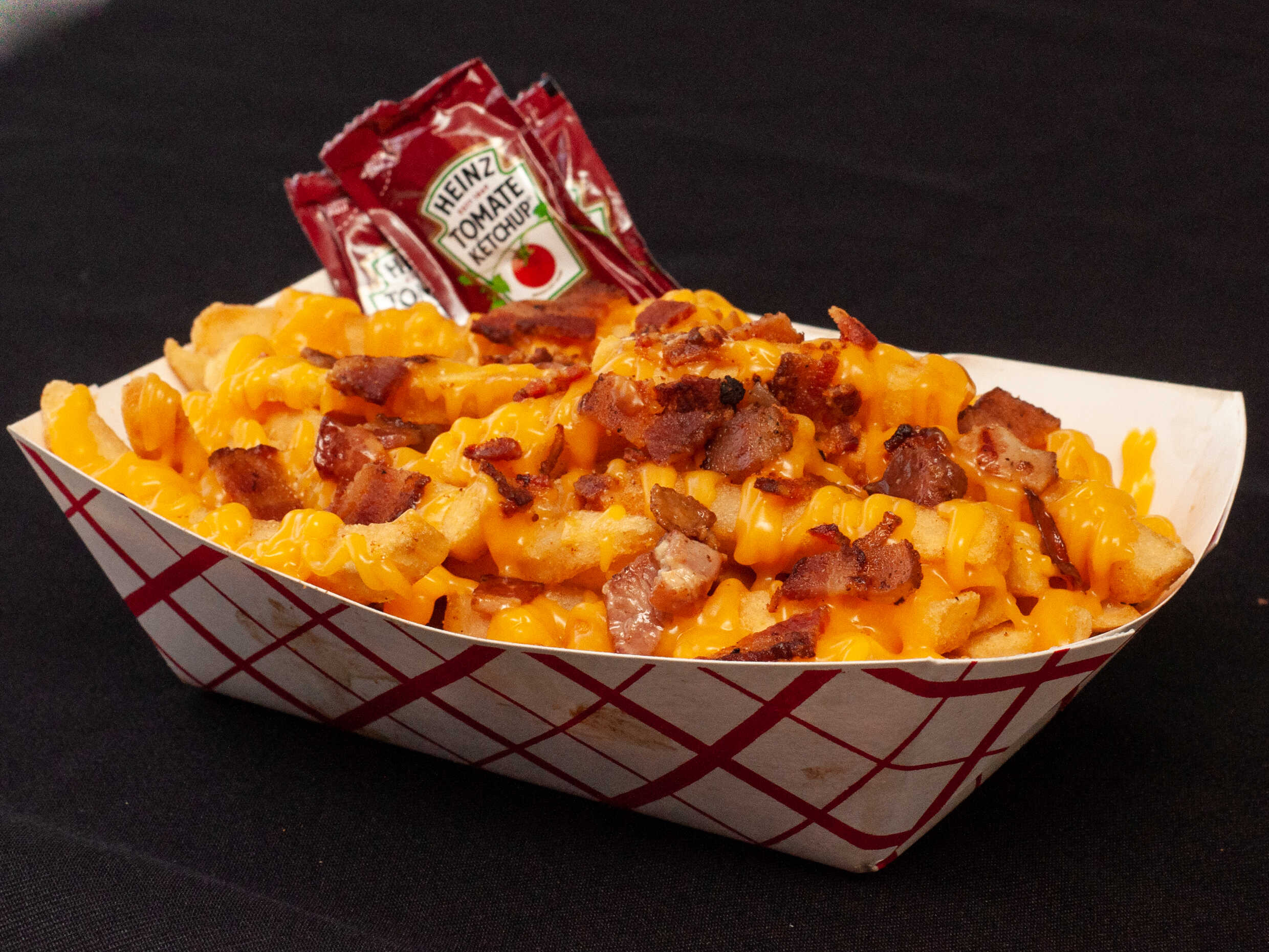 Orden de porcion de papas fritas bañadas en salsa de queso y tocino.