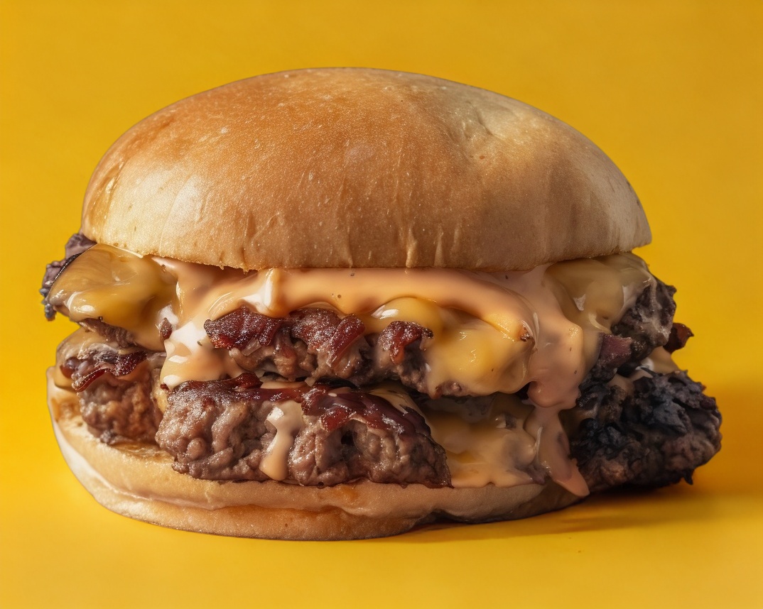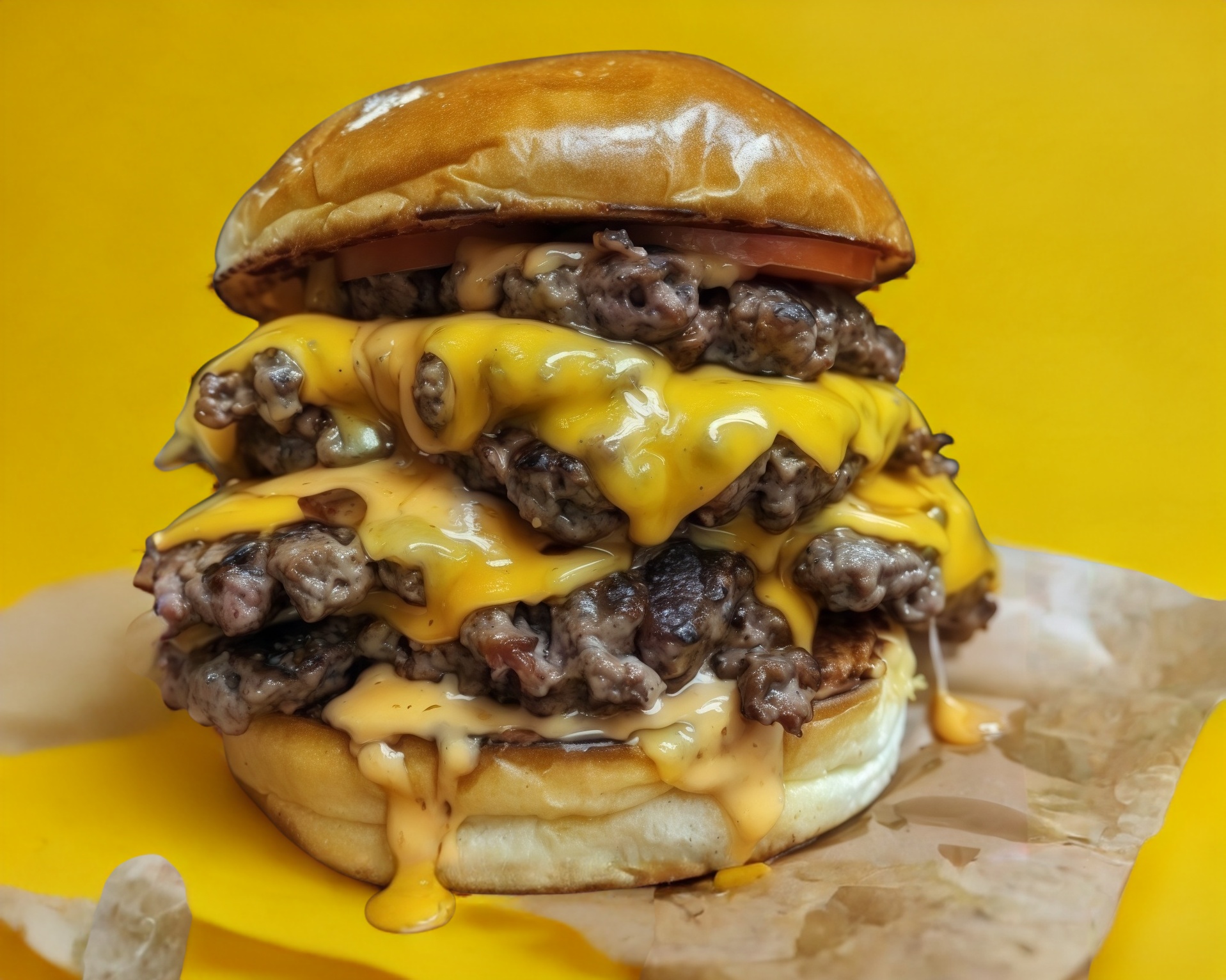 Pan brioche, aderezo especial, 4 carnes, queso américano, lechuga, tomate, cebolla.