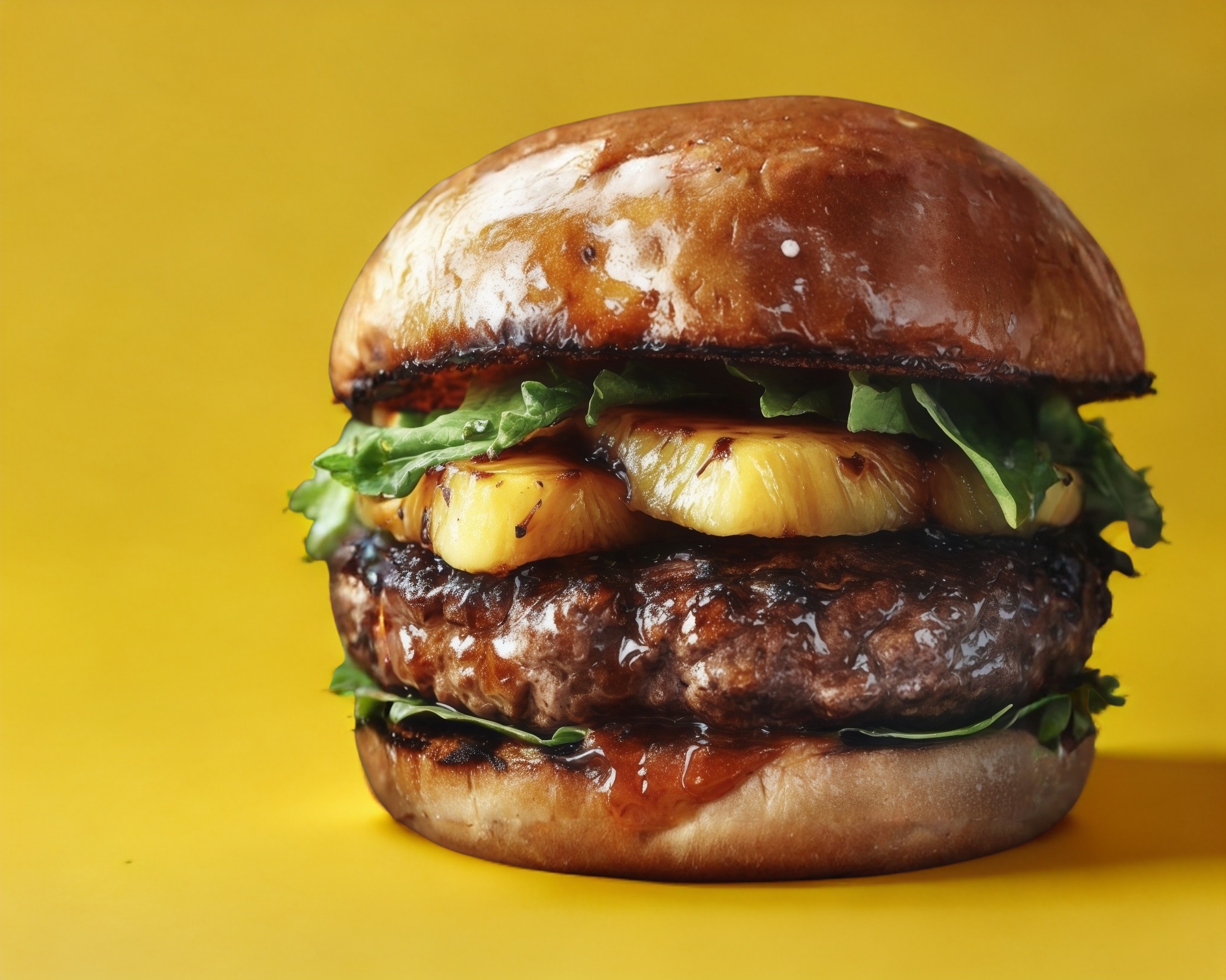 Pan brioche, aderezo especial, carne, queso américano, lechuga, tomate, cebolla y piña asada.