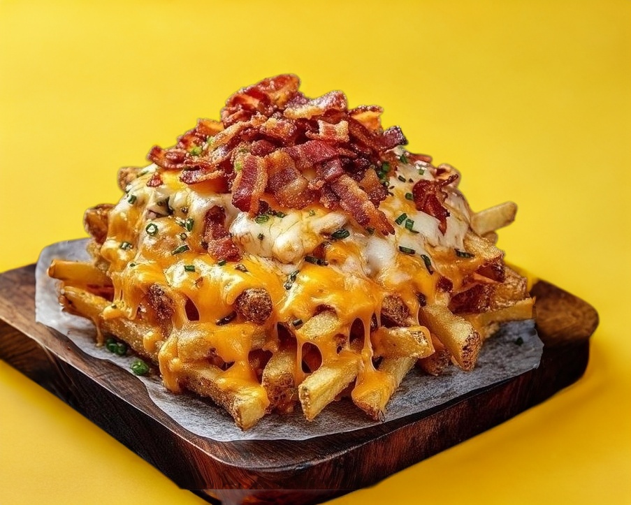 Pan brioche, aderezo especial, 2carnes , queso américano, lechuga, tomate, cebolla y papas.