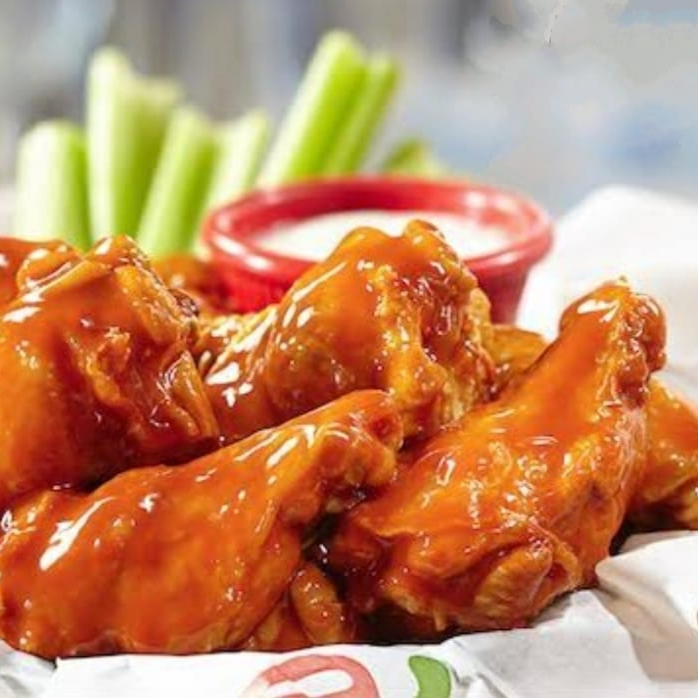 Freídas y bañadas en salsa, acompañadas con sus bastones de zanahoria y apio, así como su aderezo, incluye una porción de papas con queso.