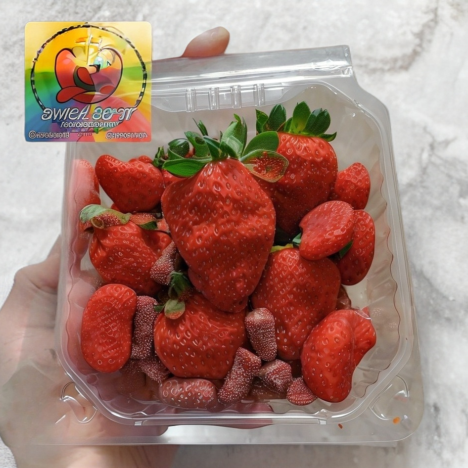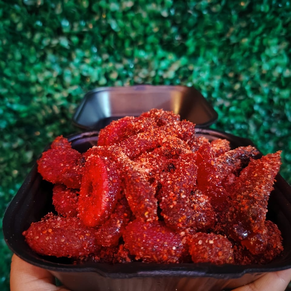 6 fresas cubiertas con tamarindo y polvo con golos , manguitos y gajos enchilados