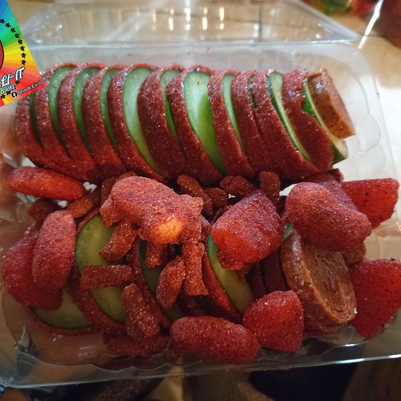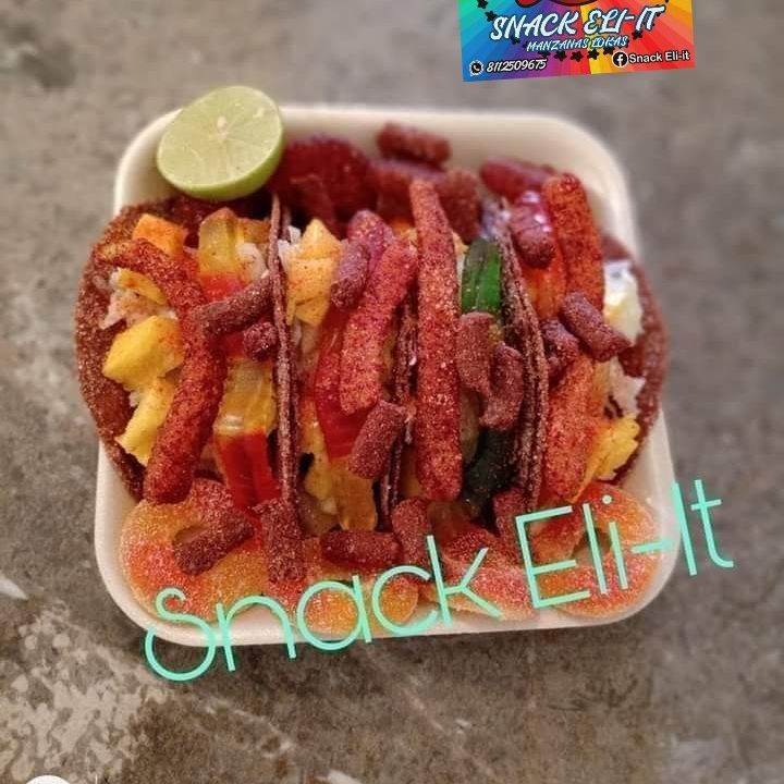 3 tacos de pepino rellenos de golos , panditas, manguitos , gajos enchilados , aros de manzana y vivoritas