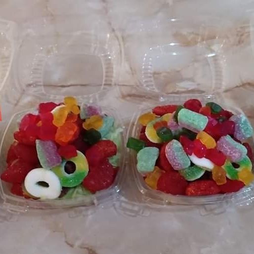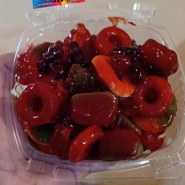 1/2 Gomitas bañadas en chamoy y polvo , golos , panditas, manguitos , gajos enchilados , aros de manzana y vivoritas