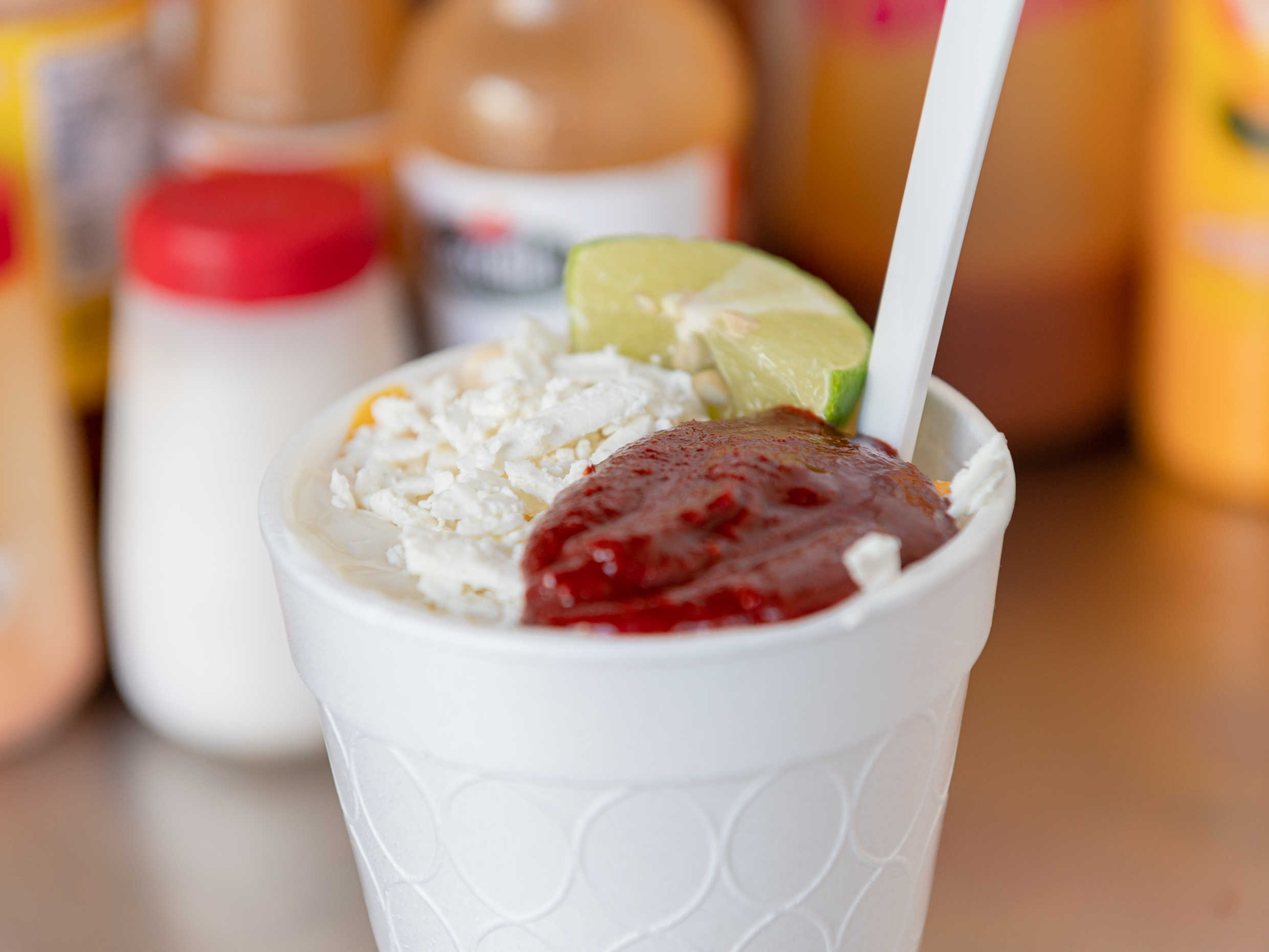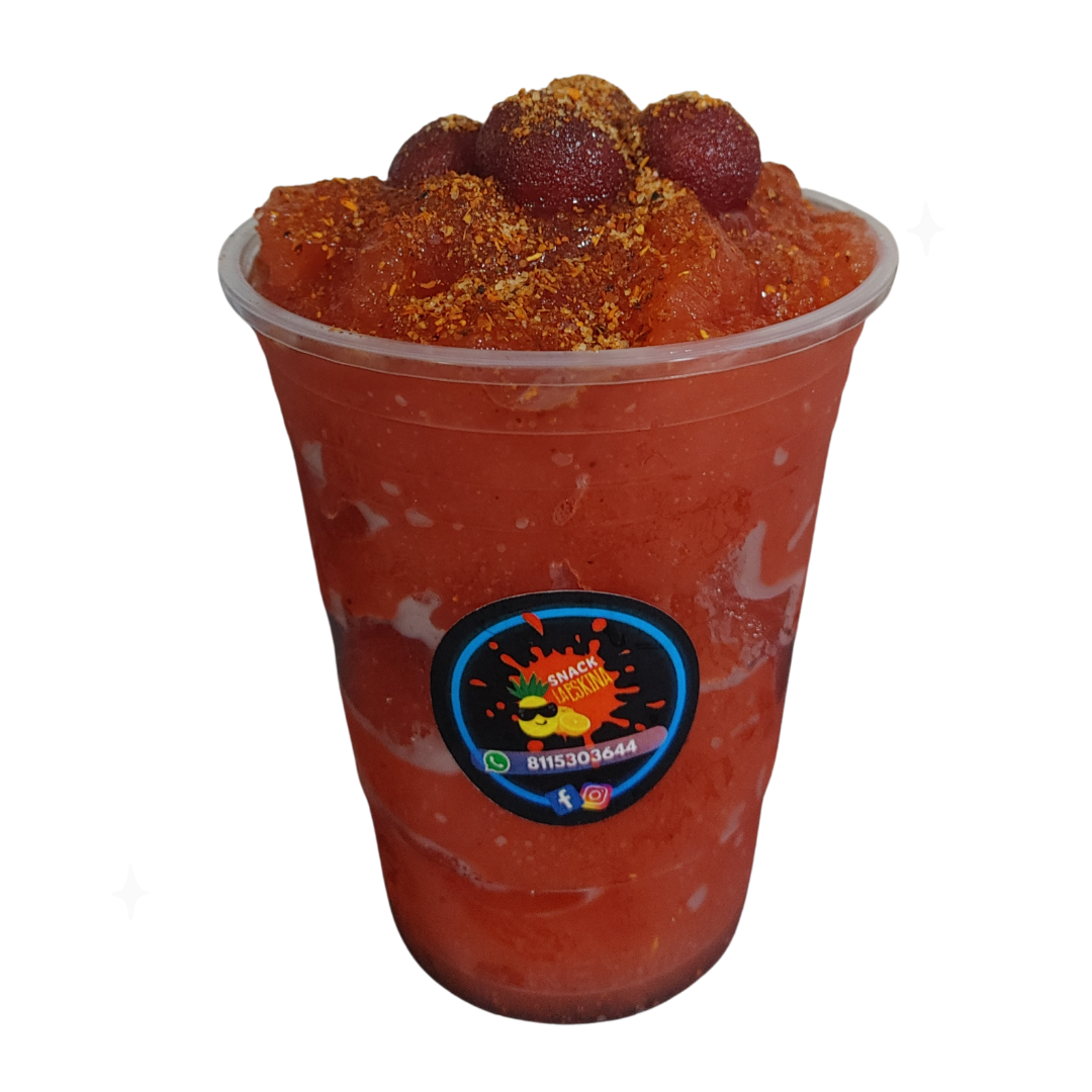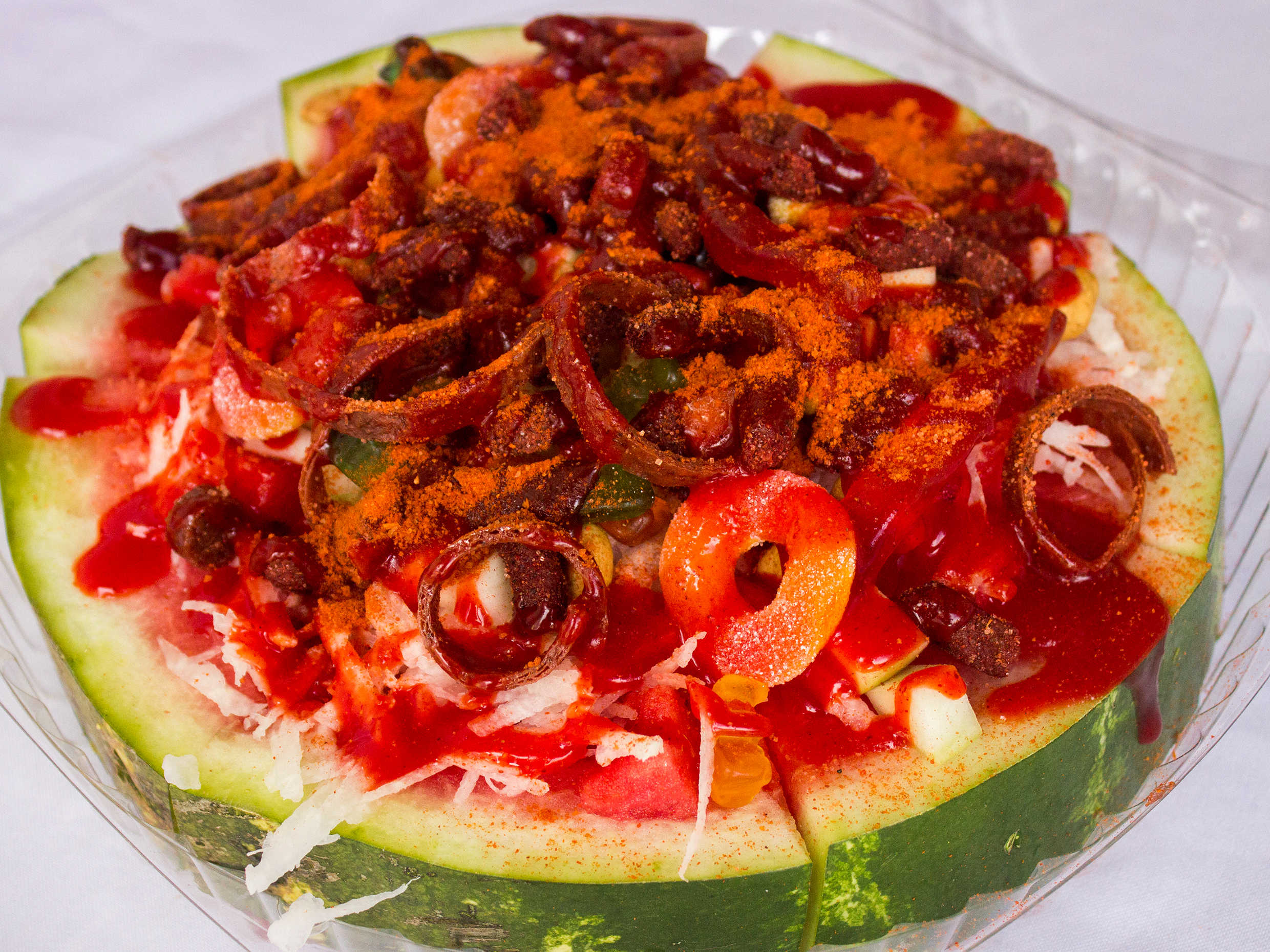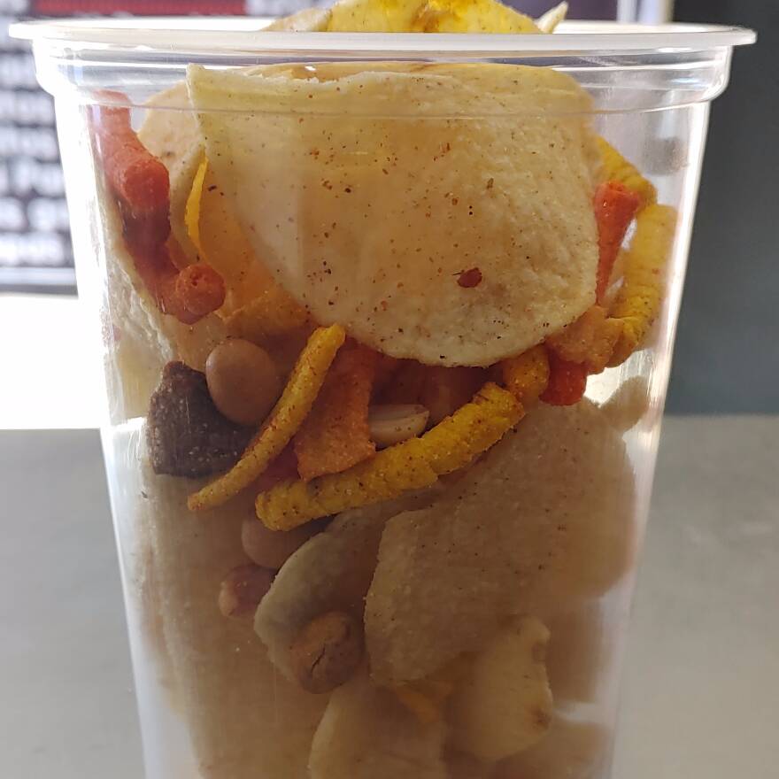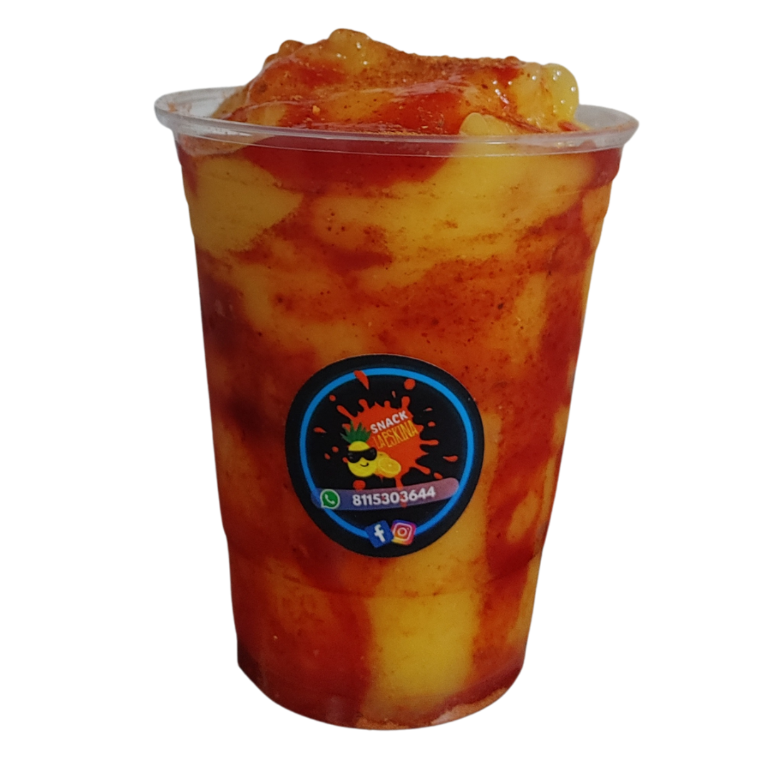 Fruta a tu elección, gomitas, golos, cacahuate japonés, chile en polvo y chamoy.