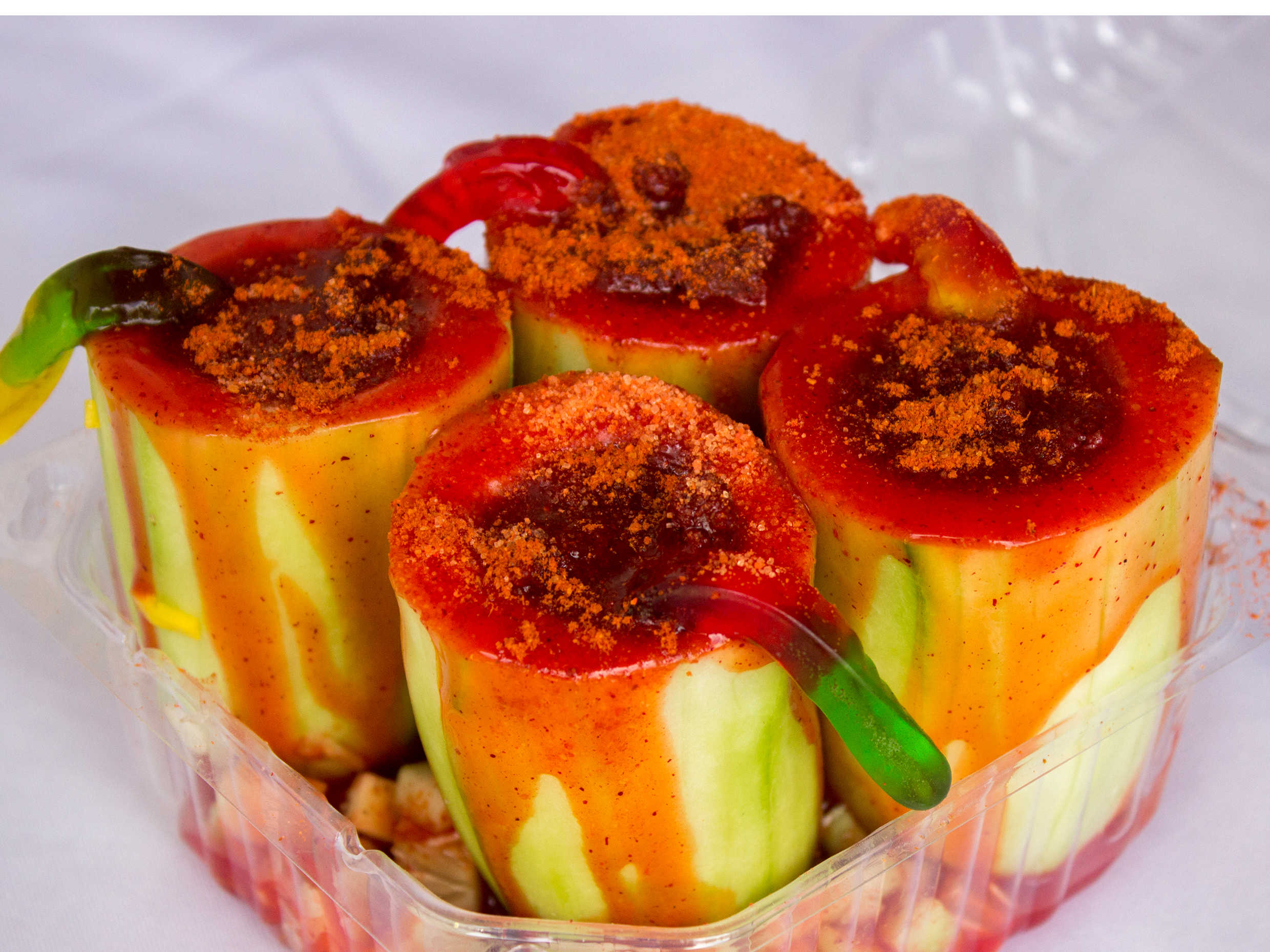 Manzana cubierta con tamarindo, tacos de jícama, frutícola en una charola.