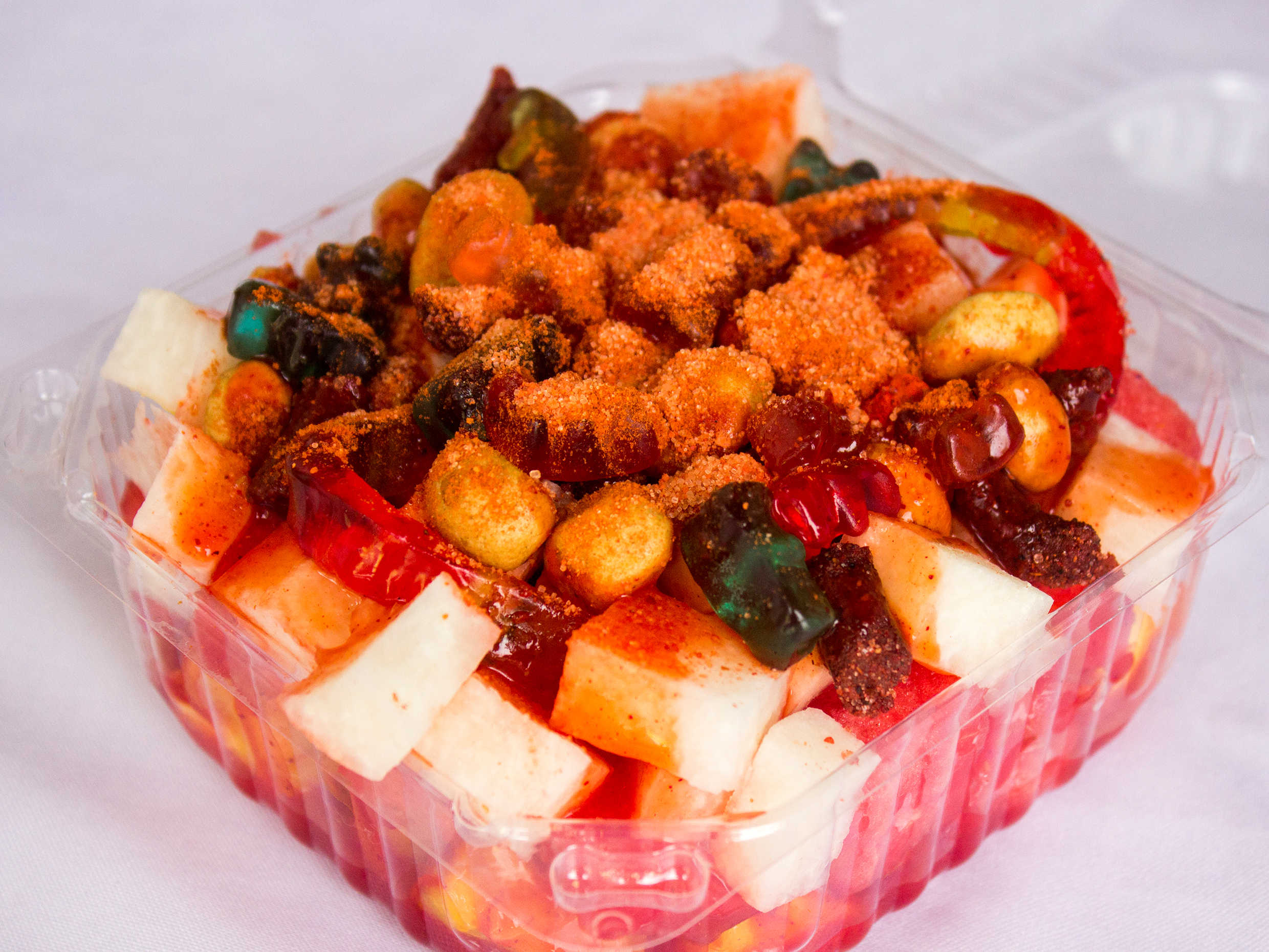 Fruta, gomitas, cacahuate, golos, chamoy, polvo.
