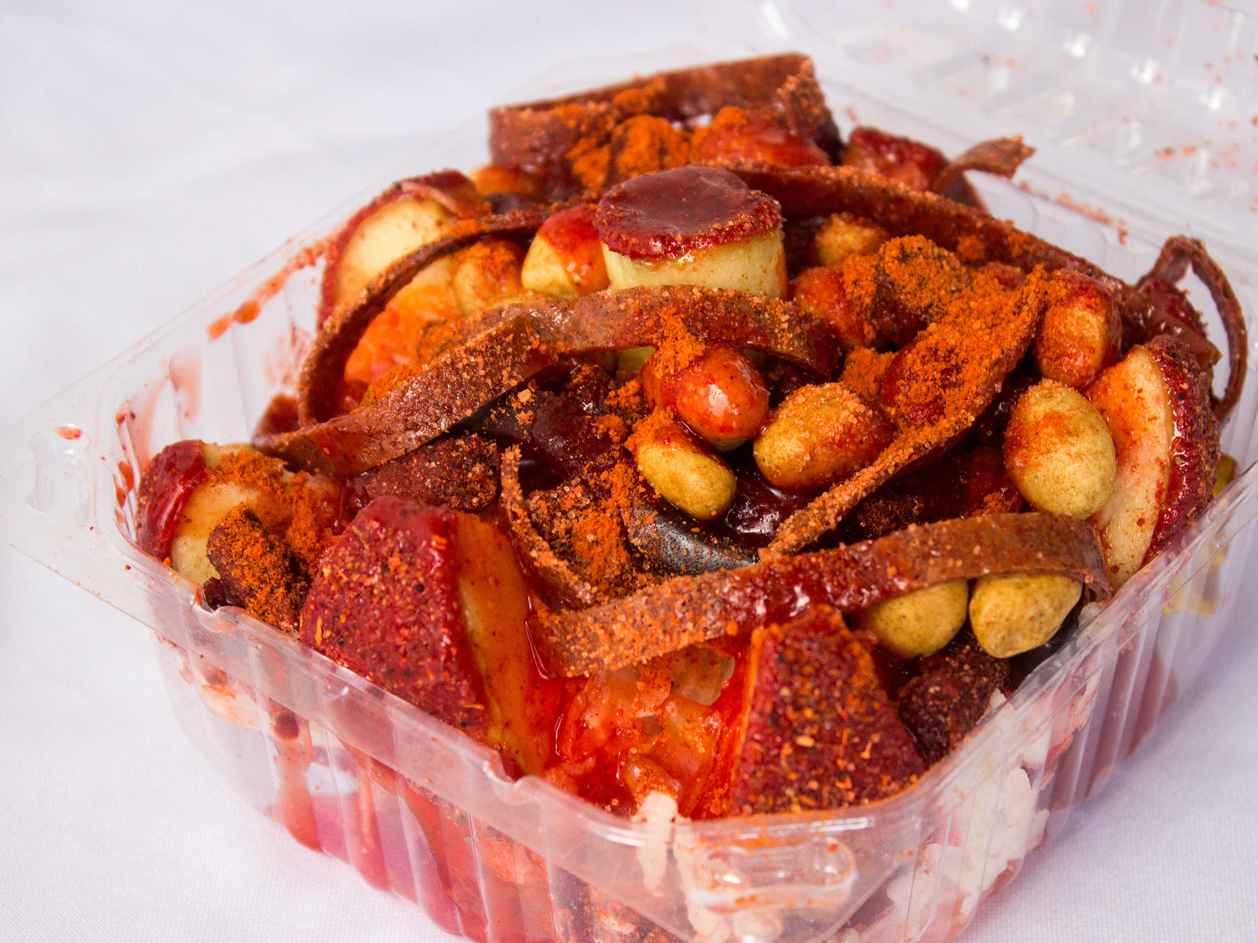 Tortilla de tamarindo, frutas, cacahuates, golos, chamoy y chile en polvo.