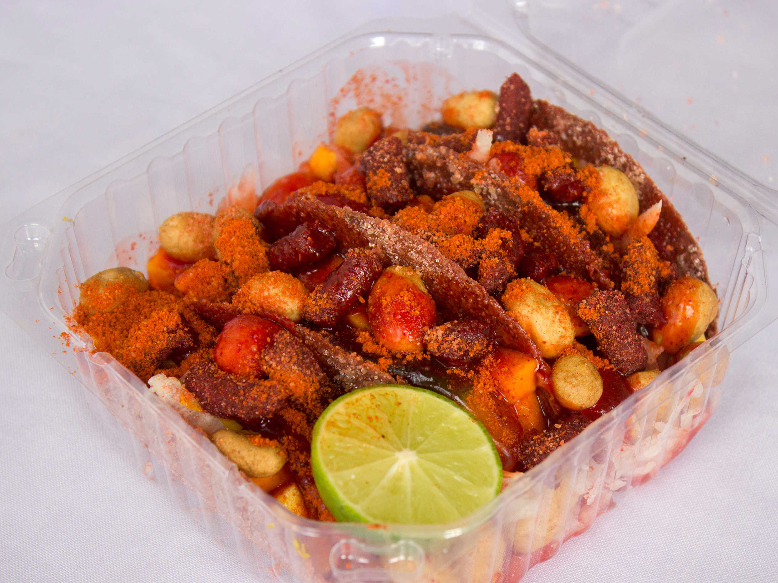 Pepinos, mango, cacahuate japonés, gomitas, golos, chile en polvo, chamoy.