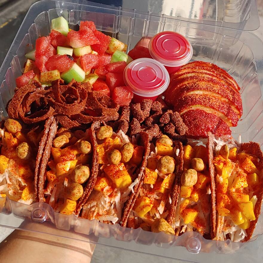 Tortilla de tamarindo, jícama, topping a escoger, cacahuate japonés, gomitas, golos, chile en polvo, chamoy (4 tacos).