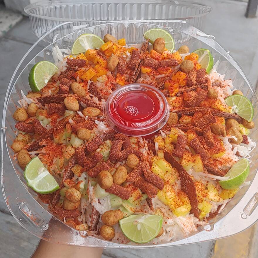 Manzana, jícama, cacahuate japonés, golos, chamoy, chile en polvo.