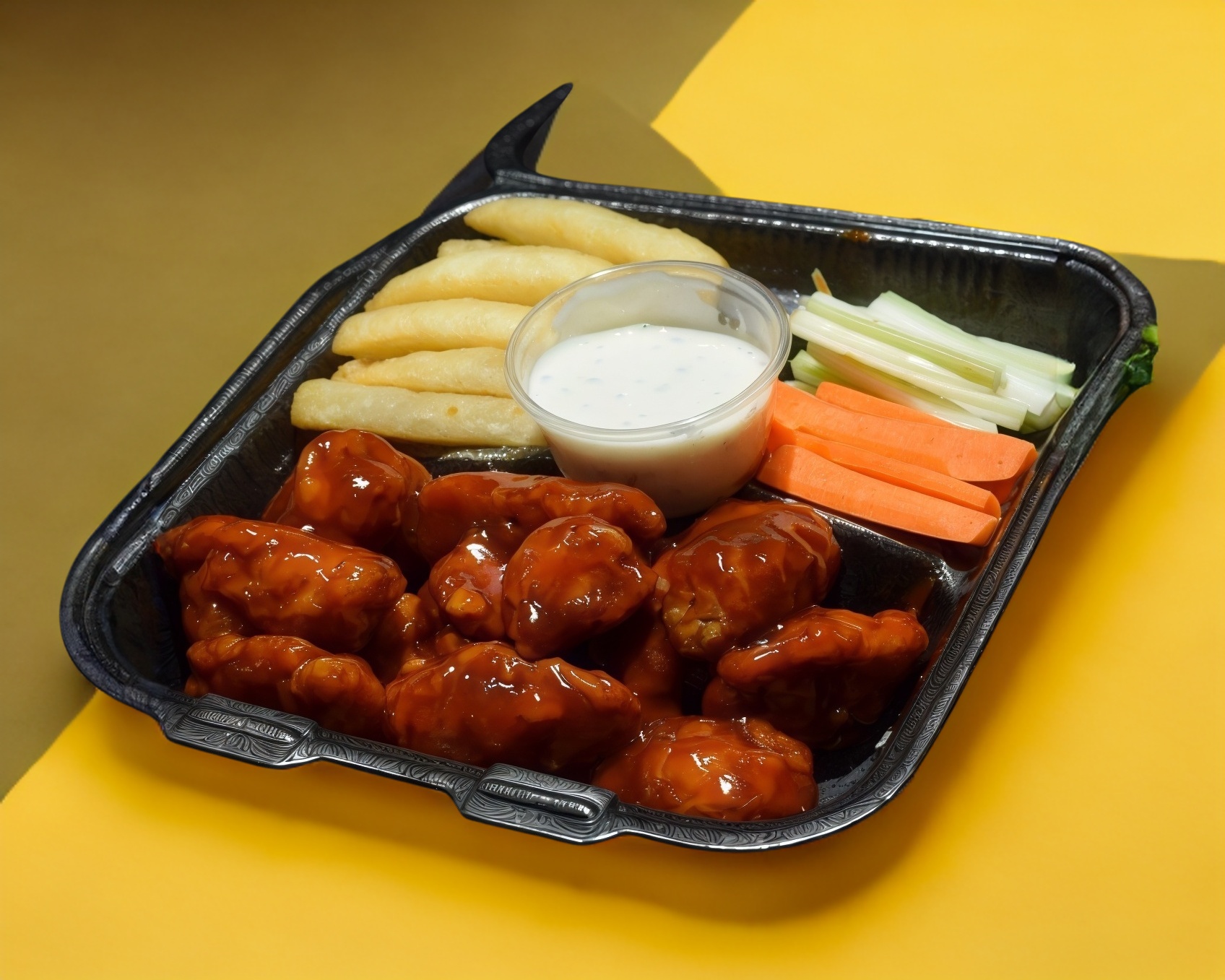 7-10 piezas de pechuga de pollo empanizadas, 400 gramos papas fritas lisas, zanahoria, apio y aderezo ranch