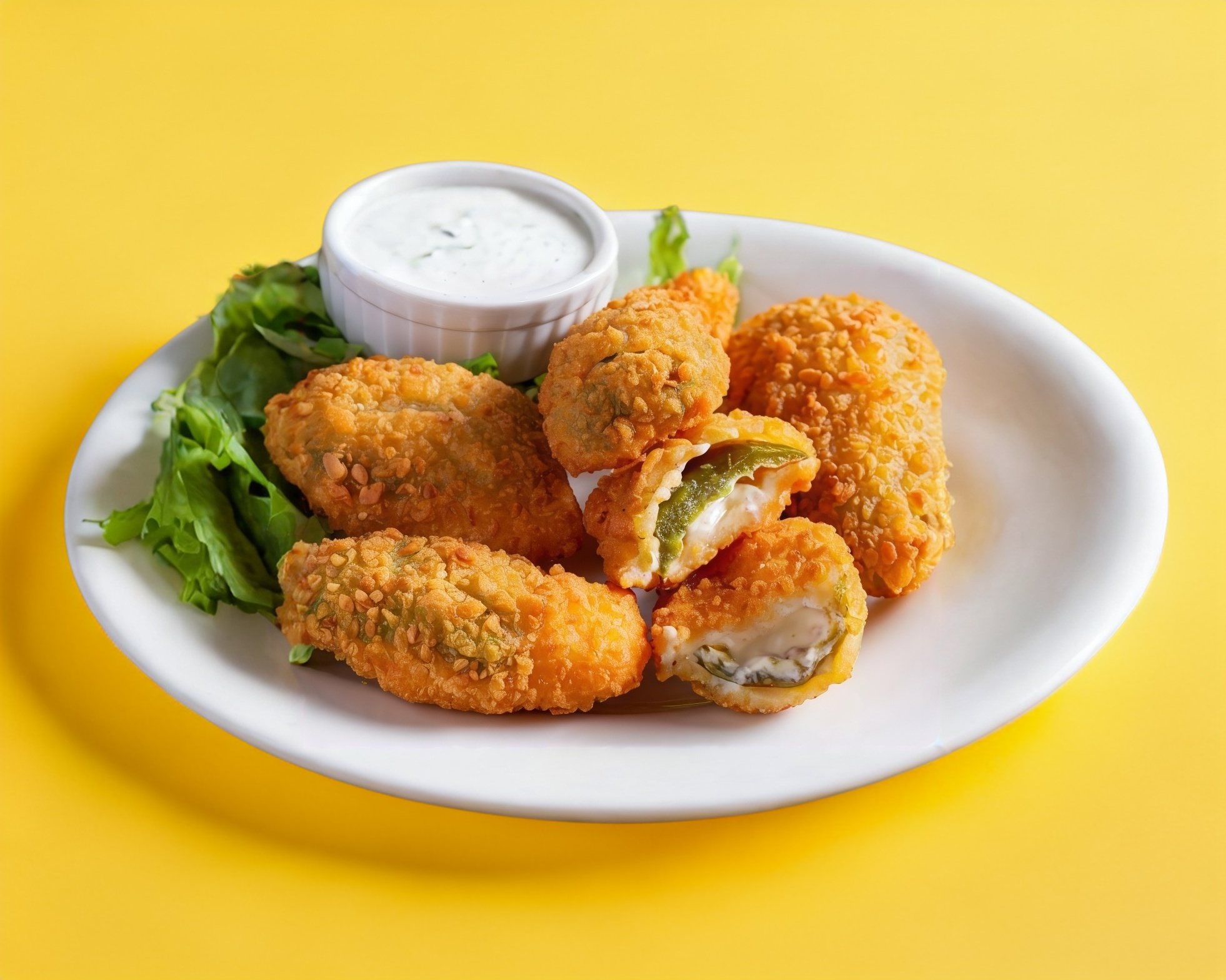 5 jalapeños rellenos de queso crema empanizados, fritos