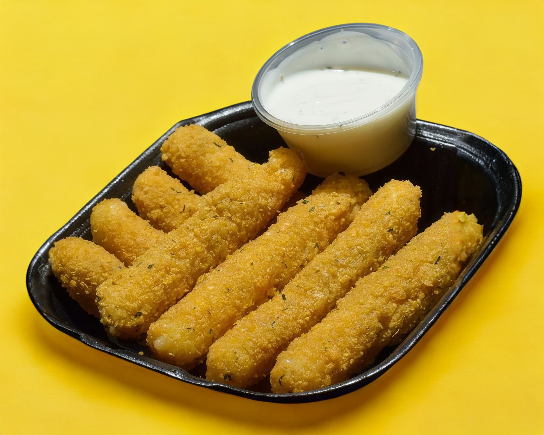 Dedos de queso tipo mozarella empanizados (8 piezas) con un aderezo ranch