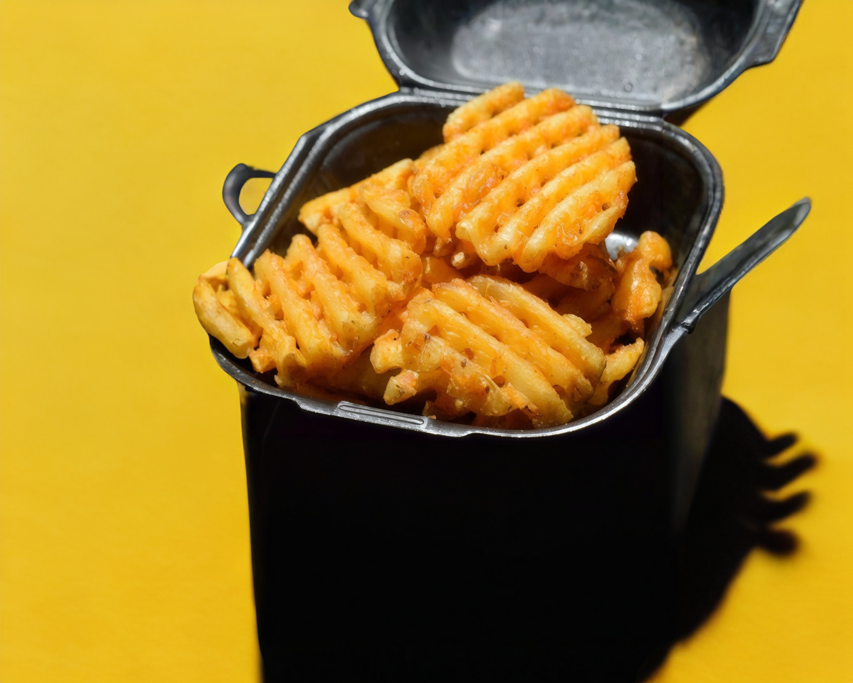Papas fritas tipo crisscut acompañadas con una porción de salsa cátsup