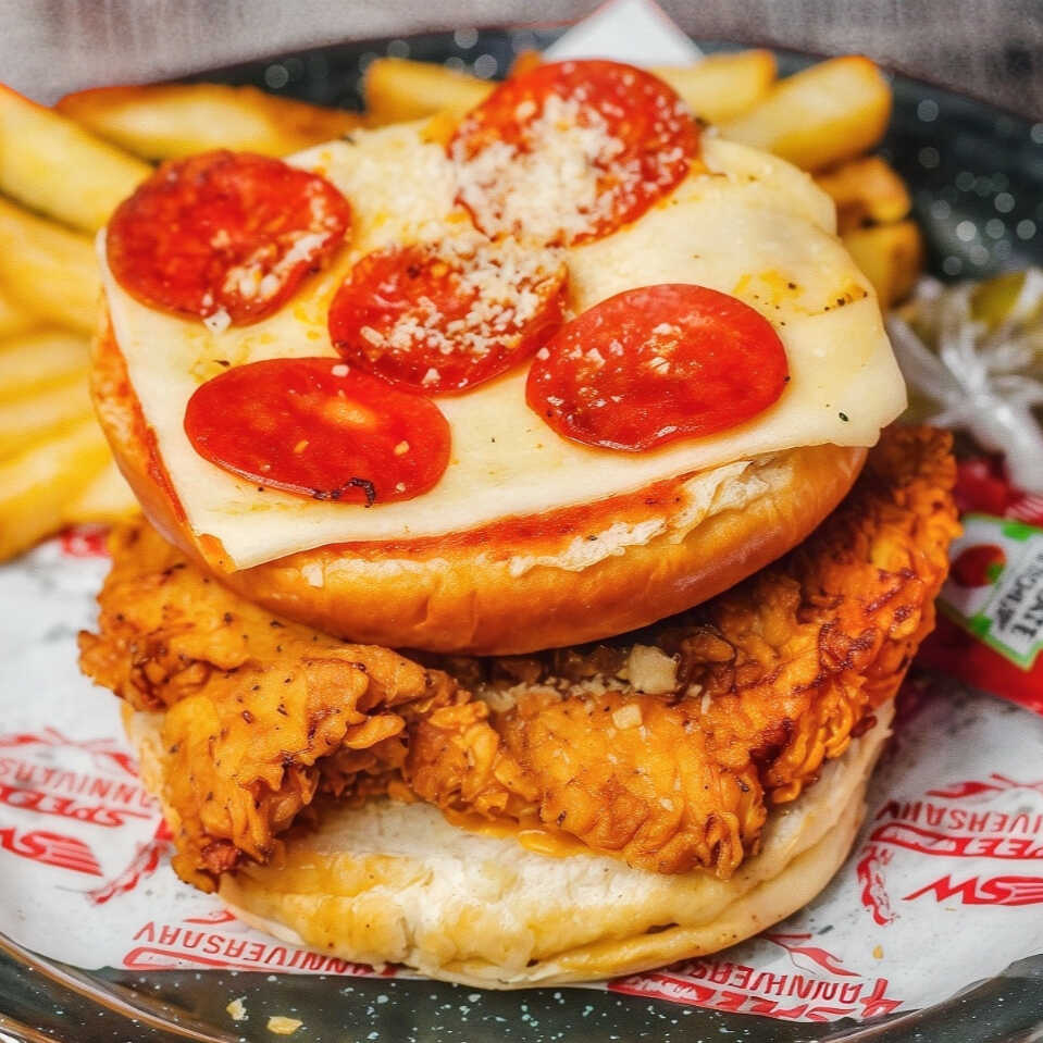 Pechuga de pollo empanizada, salsa de pizza, queso suizo, pepperoni y ajo parmesano. Acompañado de papas a la francesa