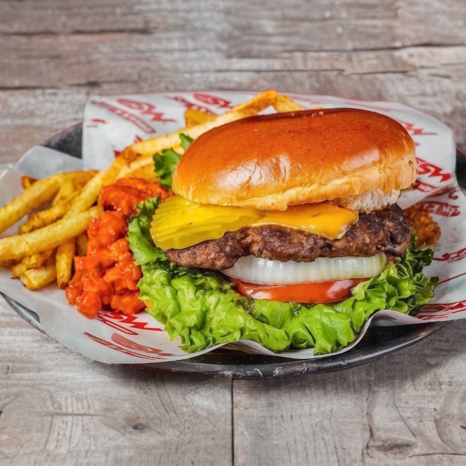 Hamburguesa de res, con queso amarillo americano, mayonesa, mostaza, lechuga, tomate y cebolla. Acompañado de papas a la francesa