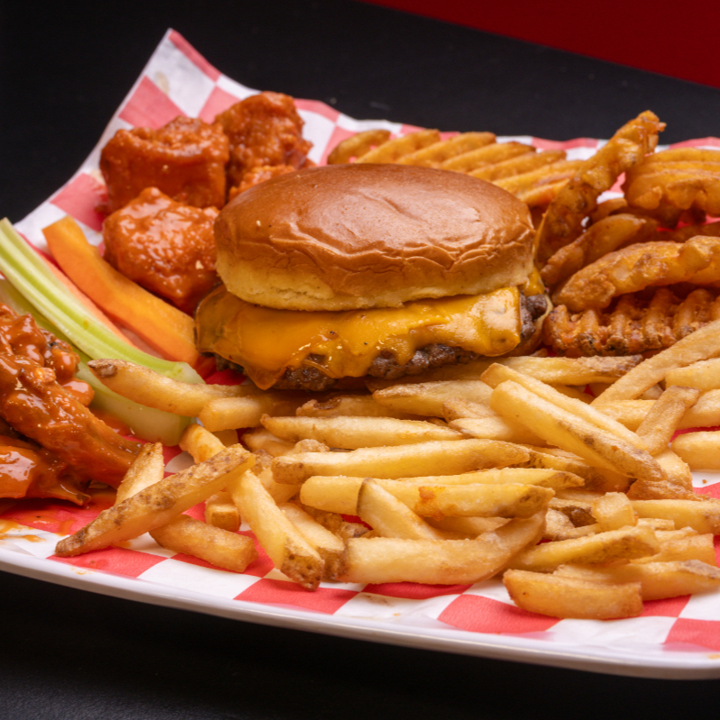 Hamburguesa de res con queso amarillo, papas a la francesa, papas crisscut, 4 alitas, 4 boneless en una salsa a elegir