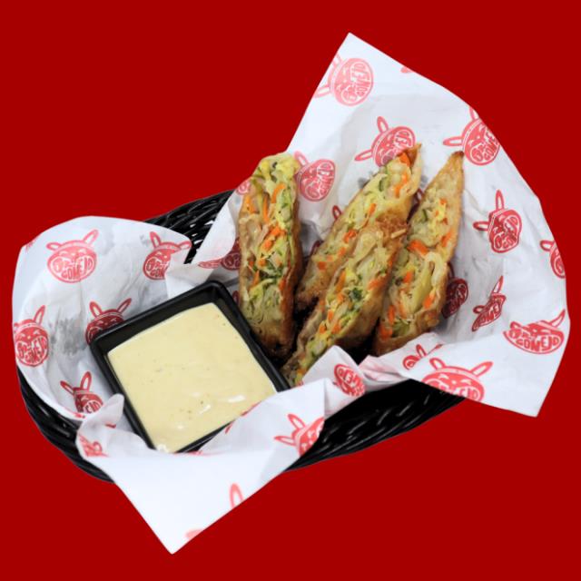 2 Pz de rollito primavera relleno de vegetales salteados .