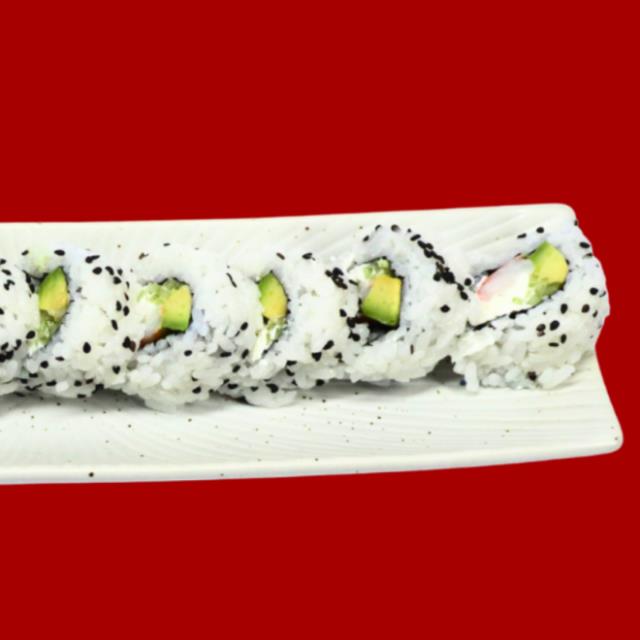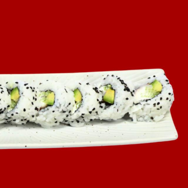 Rollo con arroz por fuera, alga nori, aguacate, queso crema y pepino, 10 pz.