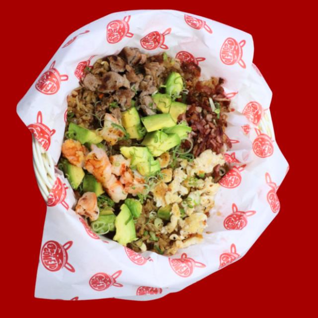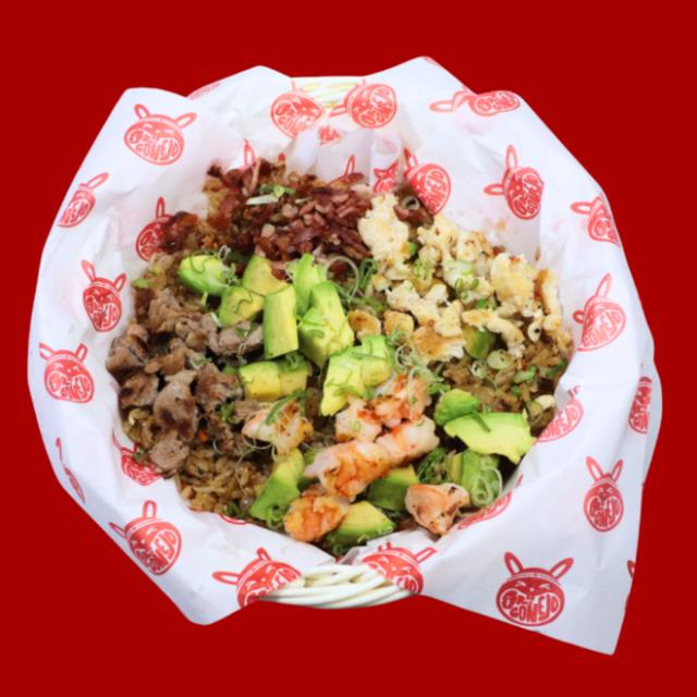 Arroz frito con pollo, sirloín, camarón y tocino, para 4 personas.