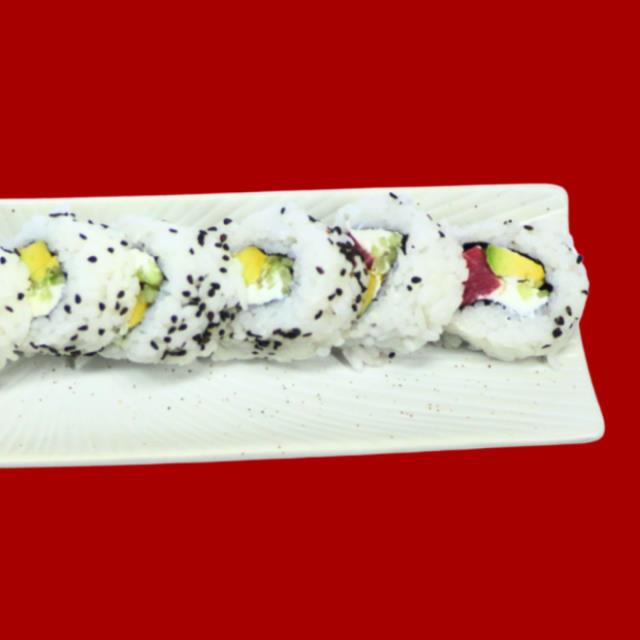 Rollo con arroz por fuera, alga nori, aguacate, queso crema, pepino y atún por dentro, 10 pz.
