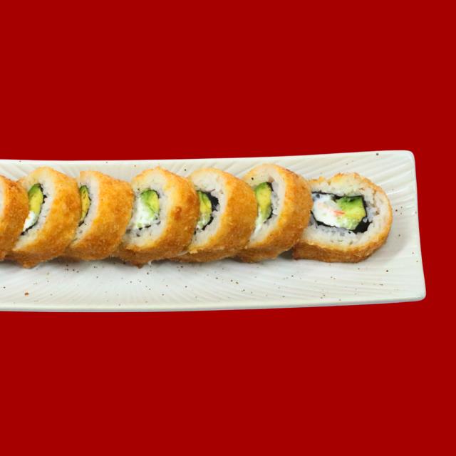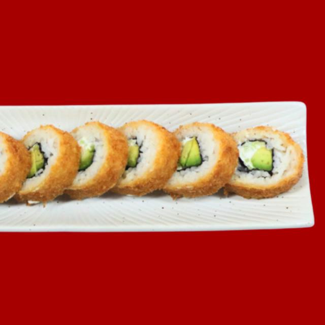 Rollo empanizado, relleno de aguacate, pepino y queso crema.
