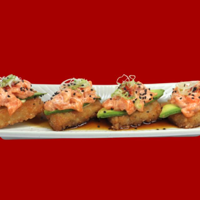 Nigiris fritos con mezcla spicy salmón por encima, 150 gr.