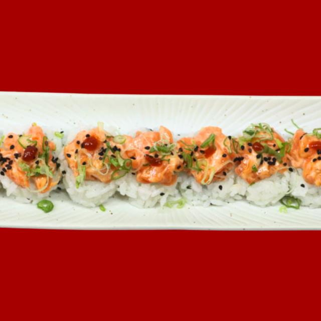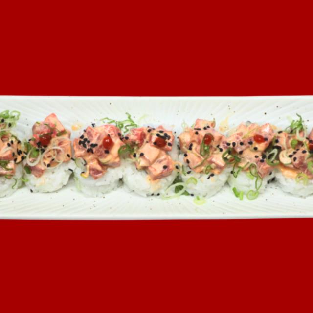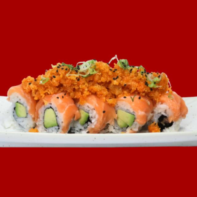 Roll con arroz, alga nori, aguacate, forrado de salmón y mezcla de tempura preparado por fuera, 8 pz.