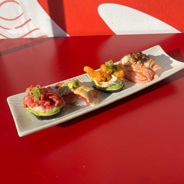 4 nigiris especiales Uno de atún asado, salmón con Tampico, pollo capeado , spicy tuna cada nigiri representa nuestros rollos más sagrados