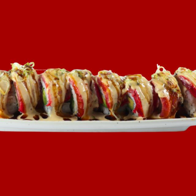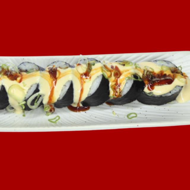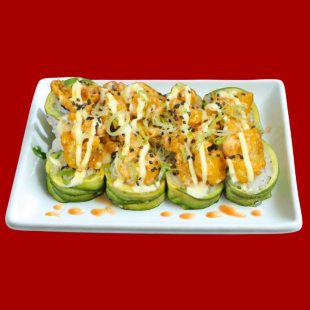 Rollo cubierto de laminas delgadas de aguacate, relleno de cebolla capeada. queso crema, pollo capeado con aderezo mayo spicy, un toque de salsa de an