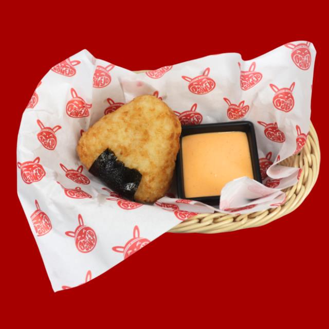Triángulo de arroz frito, relleno con queso crema y aguacate.