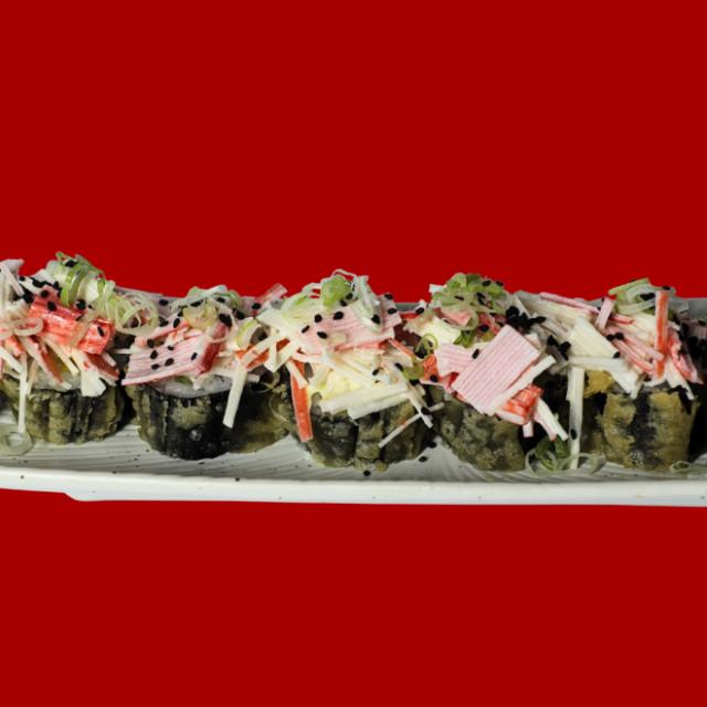 Rollo al tempura, relleno con queso crema y aguacate, coronado de ensalada de kanikama, 8 pz.