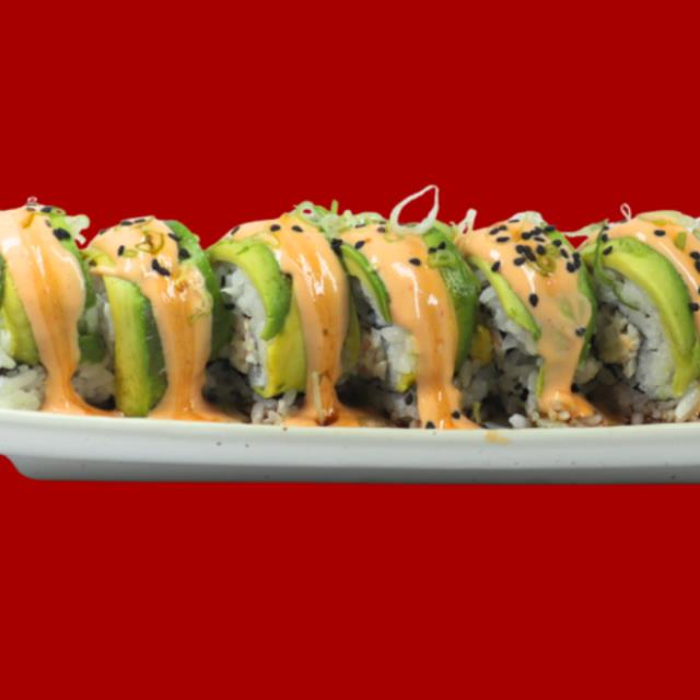 Rollo forrado de aguacate, relleno de tampico, anguila ahumada, bañado en spicy y salsa de anguila, 8 pz.