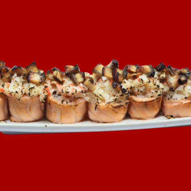 Rollo cubierto de salmón asado, relleno de aguacate queso crema, coronado con tampico y anguila ahumada, salsa de anguila y ajonjolí