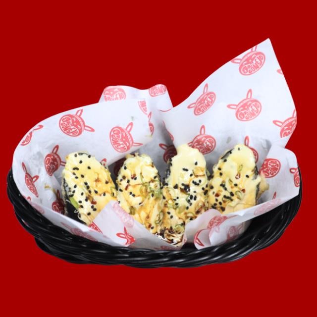 Rollo tempura relleno con queso crema, aguacate, pepino, bañado de la salsa blanca del conejo y salsa de anguila, 4 pz.